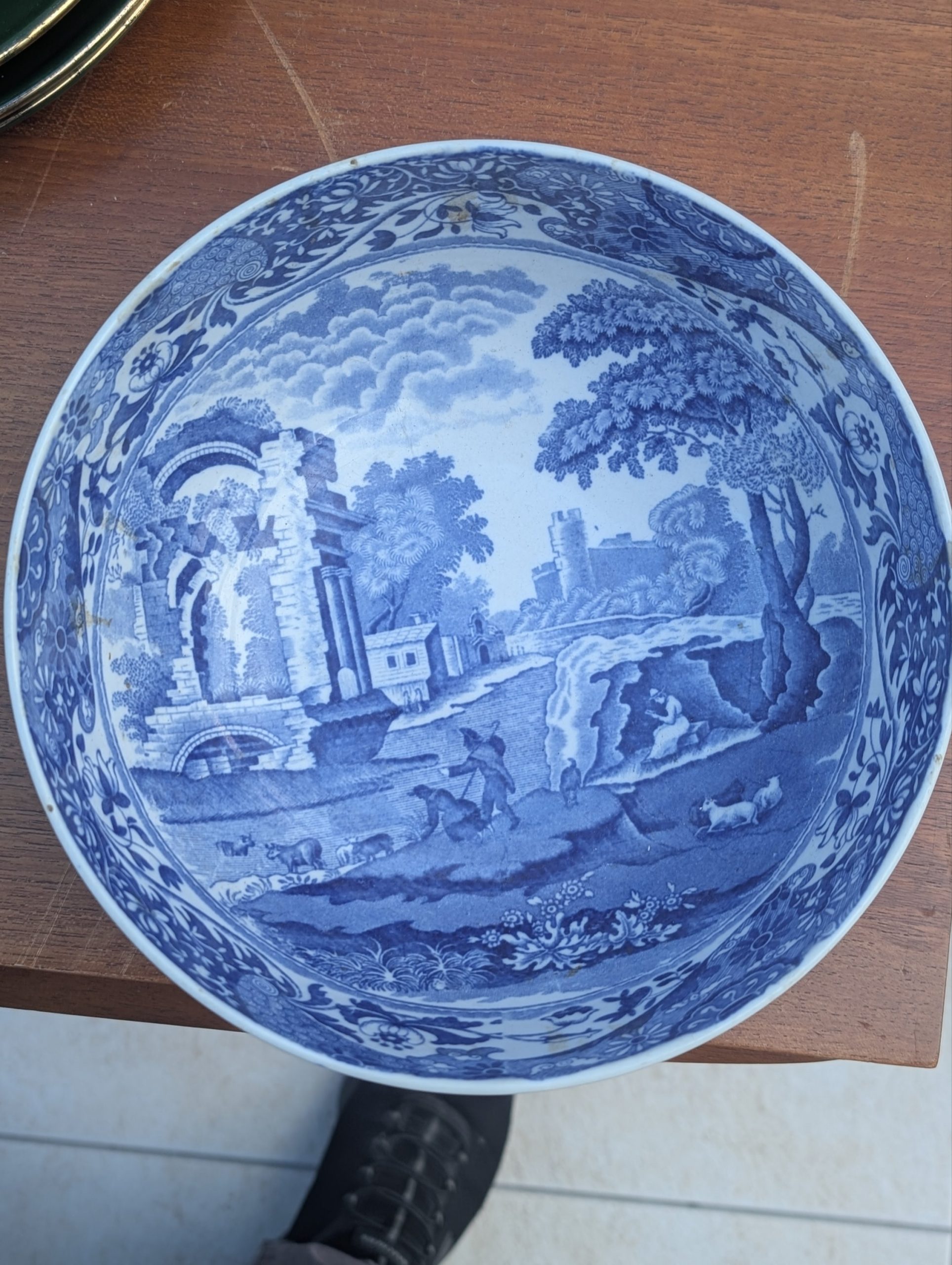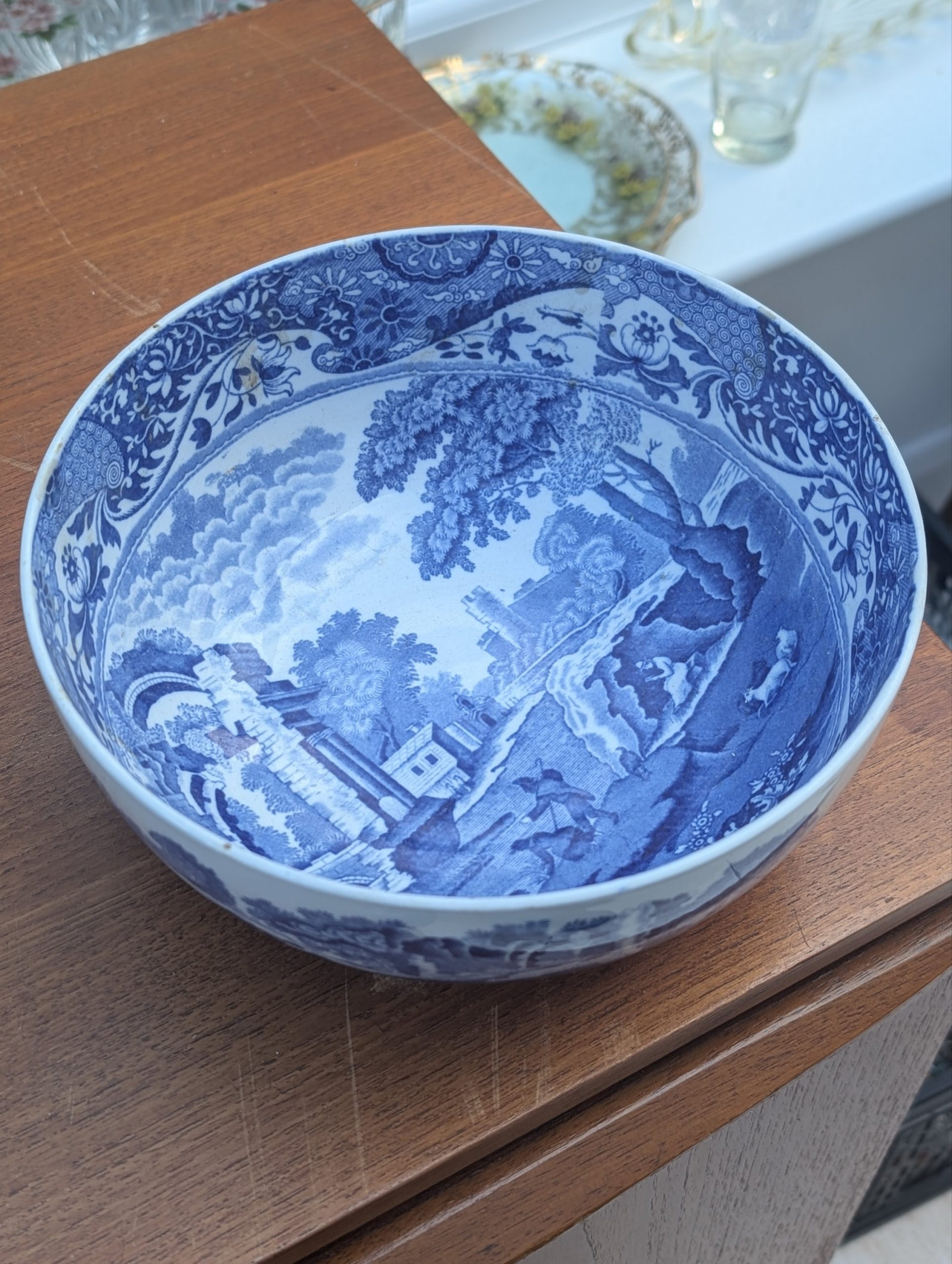 Antique Copeland Spode “Italian” pattern bowl in classic blue and white. Detailed pastoral scene with ruins and floral border. Clearly marked to the base “Copeland Spode’s Italian England”. Ideal as a serving bowl or display piece.