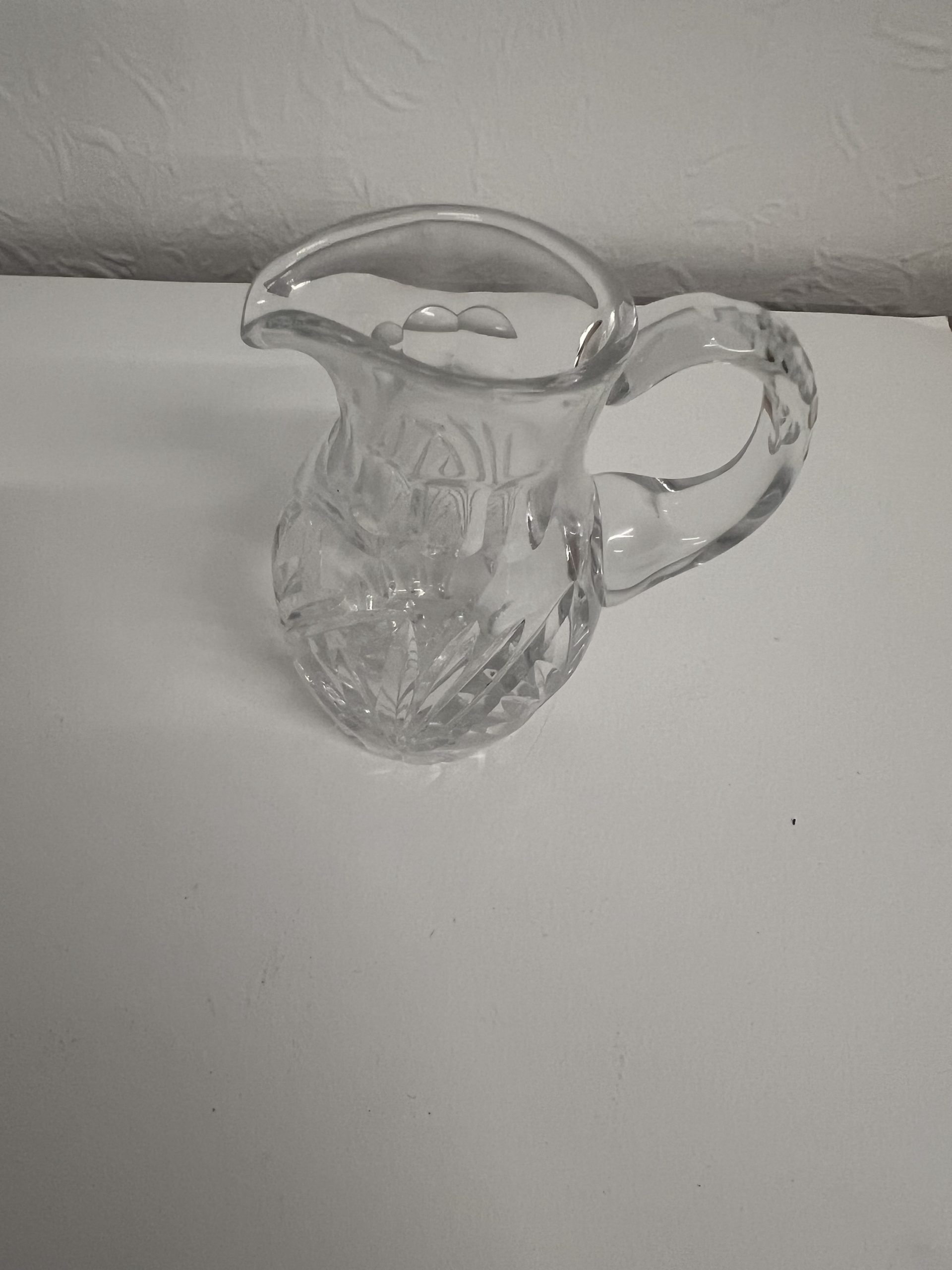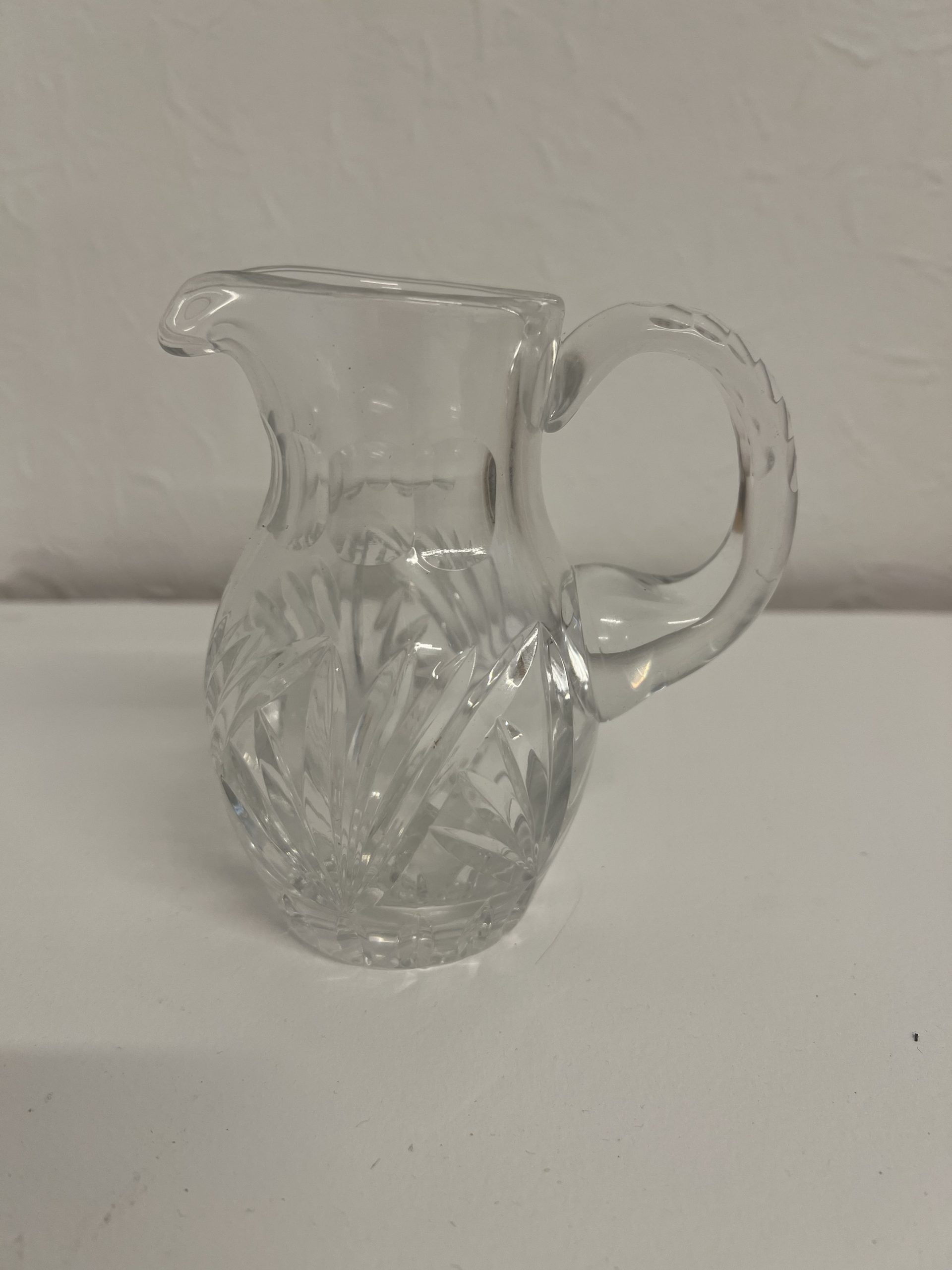 Small cut glass / pressed glass cream jug (milk pitcher). Starburst and fan cut pattern to lower body, plain upper with shaped spout and applied handle. Likely late 20th century mass-produced (Bohemia/Polish style), unbranded.