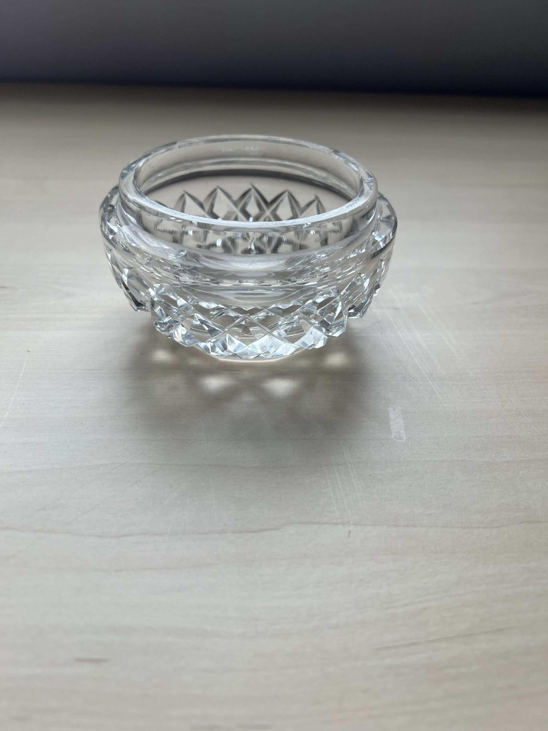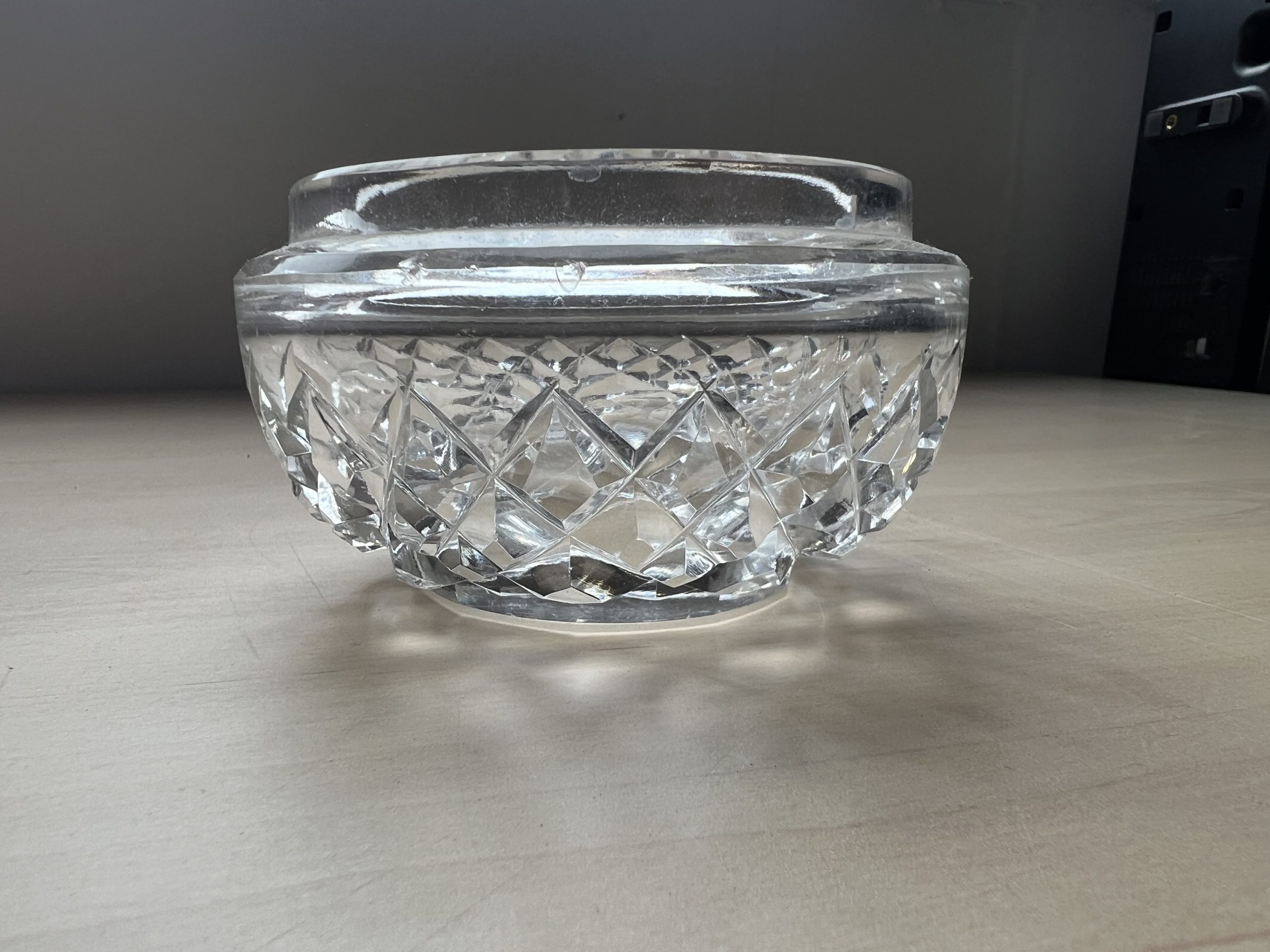 Cut glass / lead crystal small bowl or ashtray. Heavy for size (≈400g), deep diamond and fan cut pattern, likely late 20th century mass-produced (Bohemia/Edinburgh-style but no visible mark so treat as unbranded).