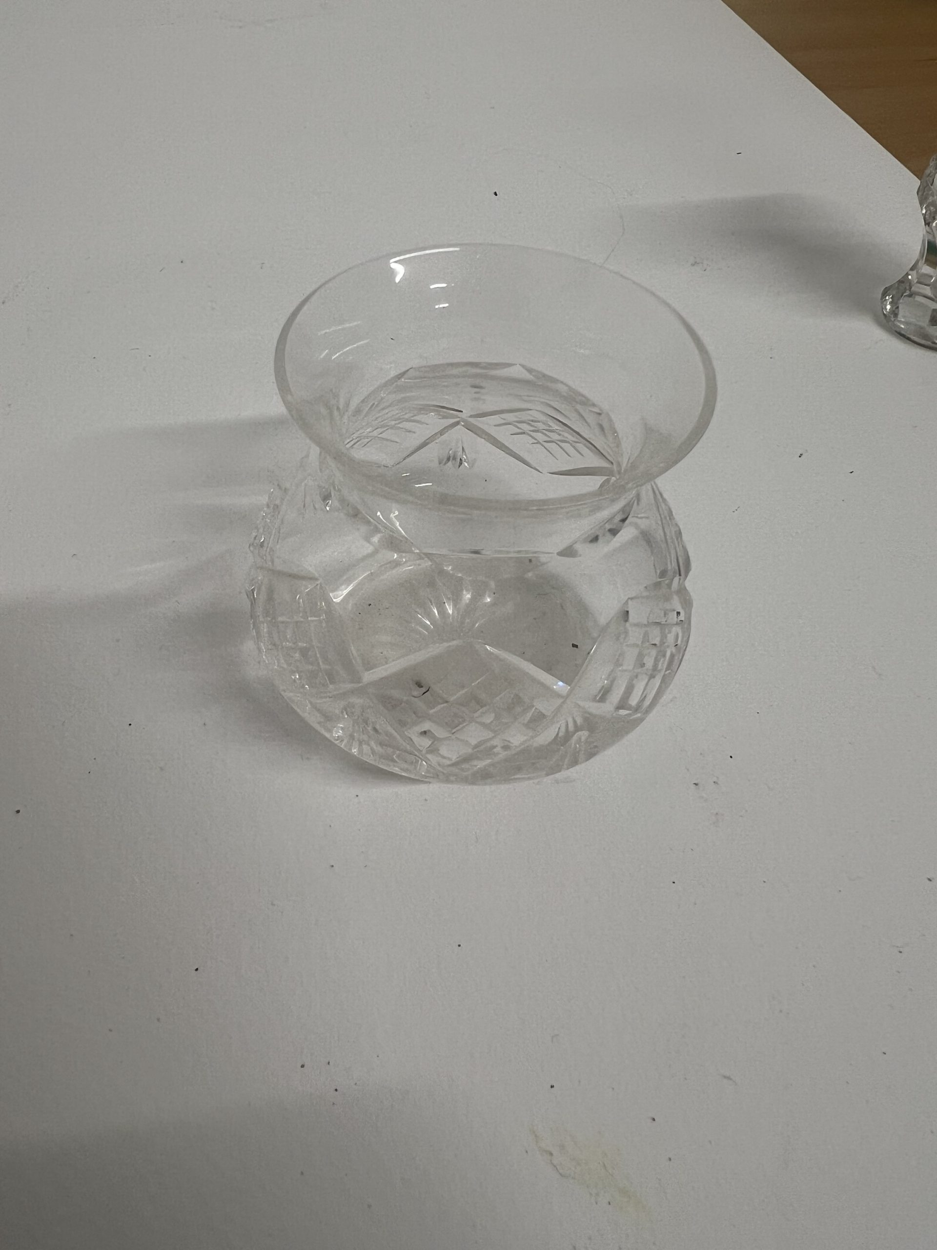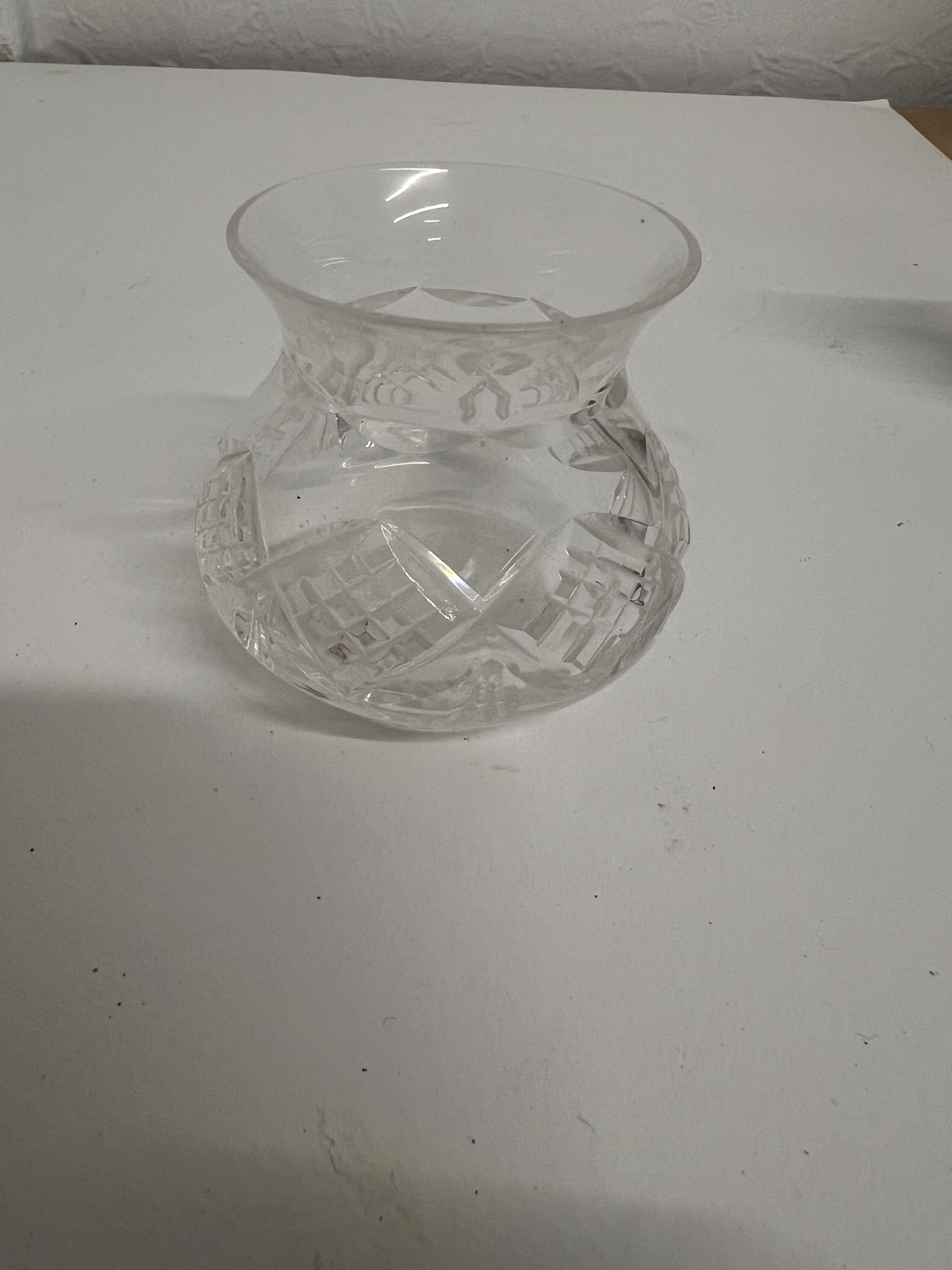 Cut glass/crystal bowl or small vase with flared rim. Likely pressed or cut glass (not high-end lead crystal). Decorative geometric cut pattern (diamond/triangle panels). No visible maker’s mark