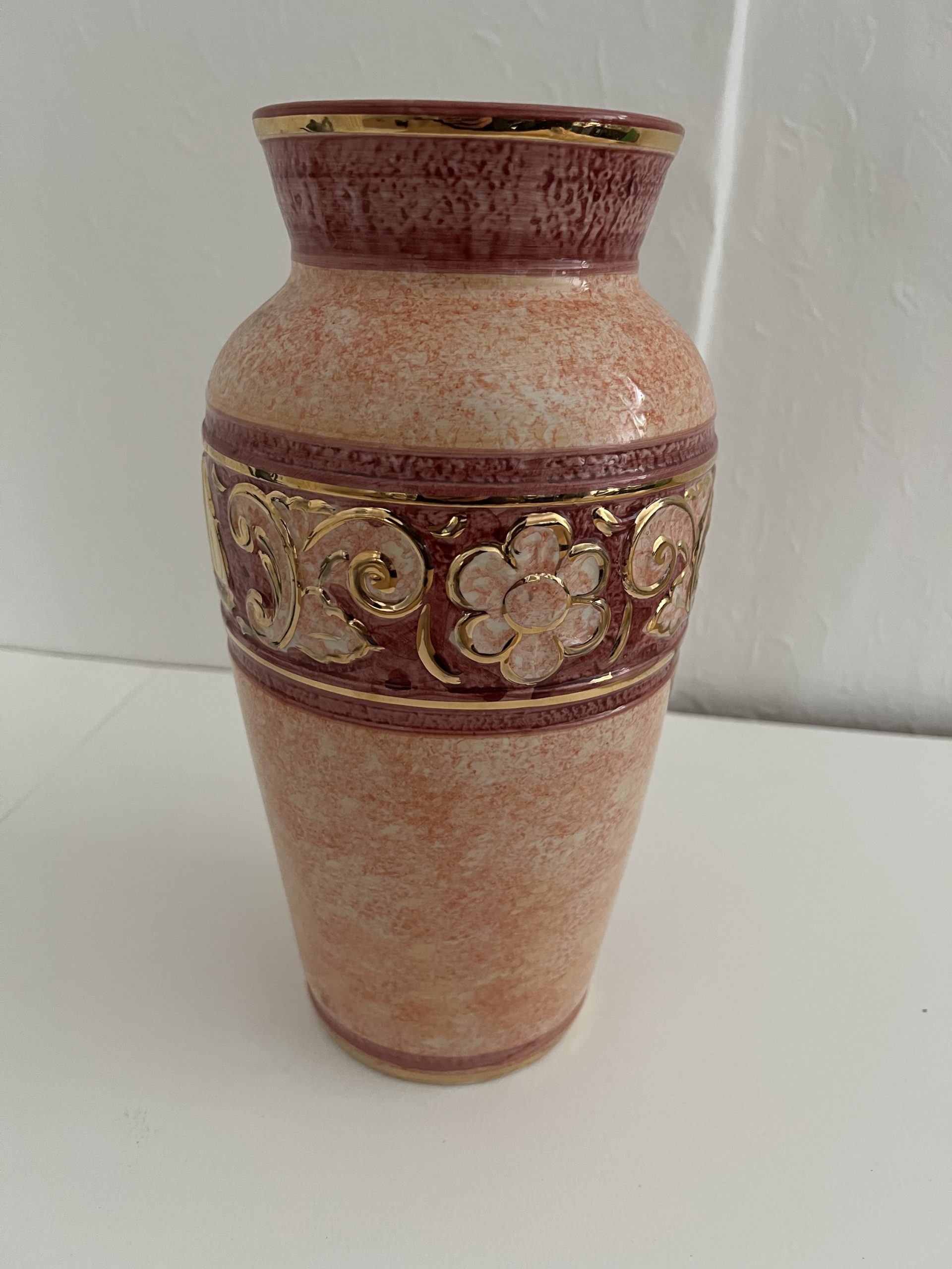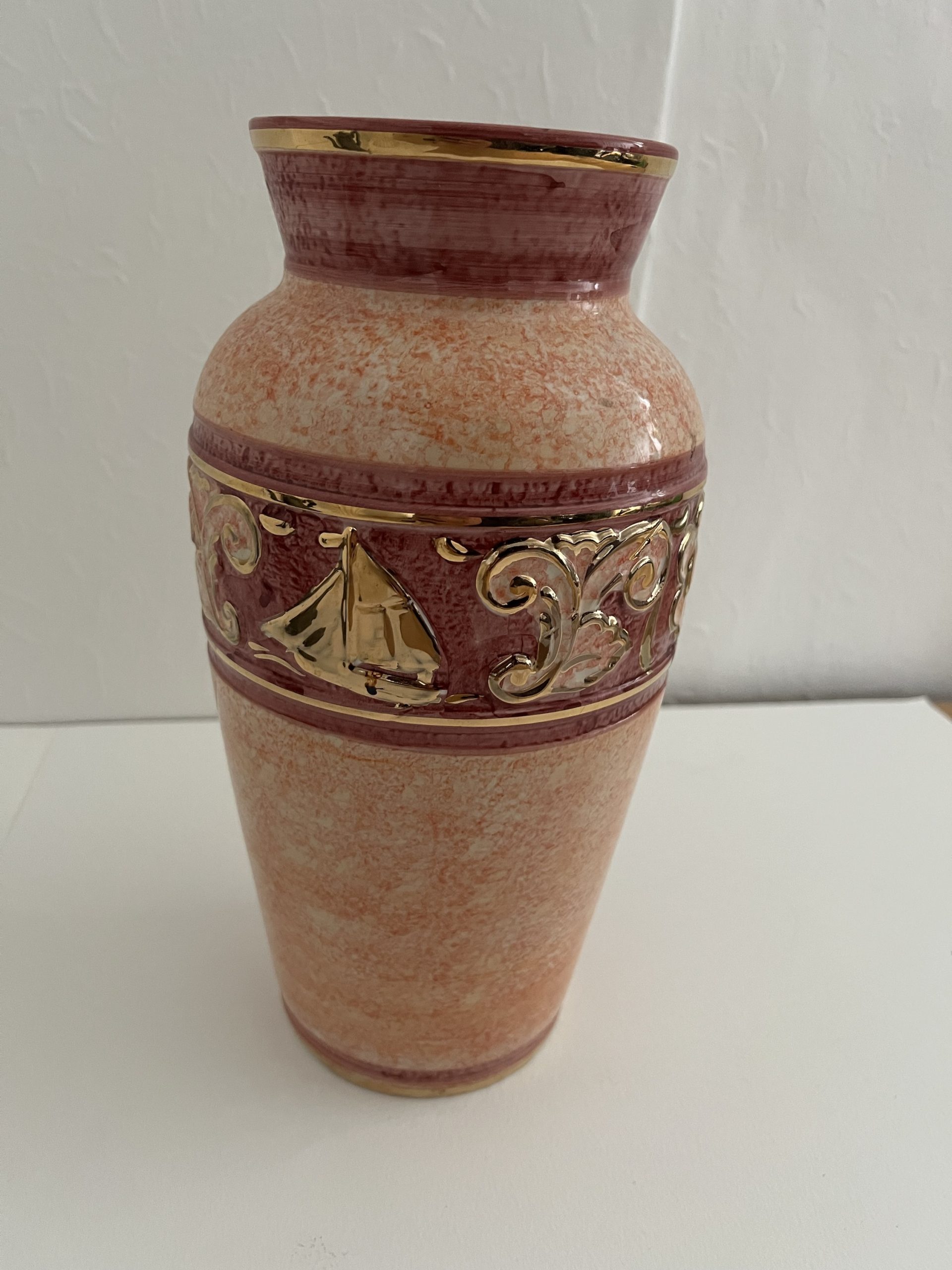 Decorative ceramic vase, mid-size, pink/peach mottled glaze with burgundy band and applied gold scroll + sailing ship motif. Modern mass-produced décor (late 20th / early 2000s).