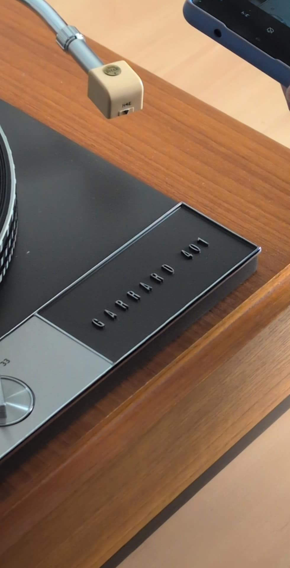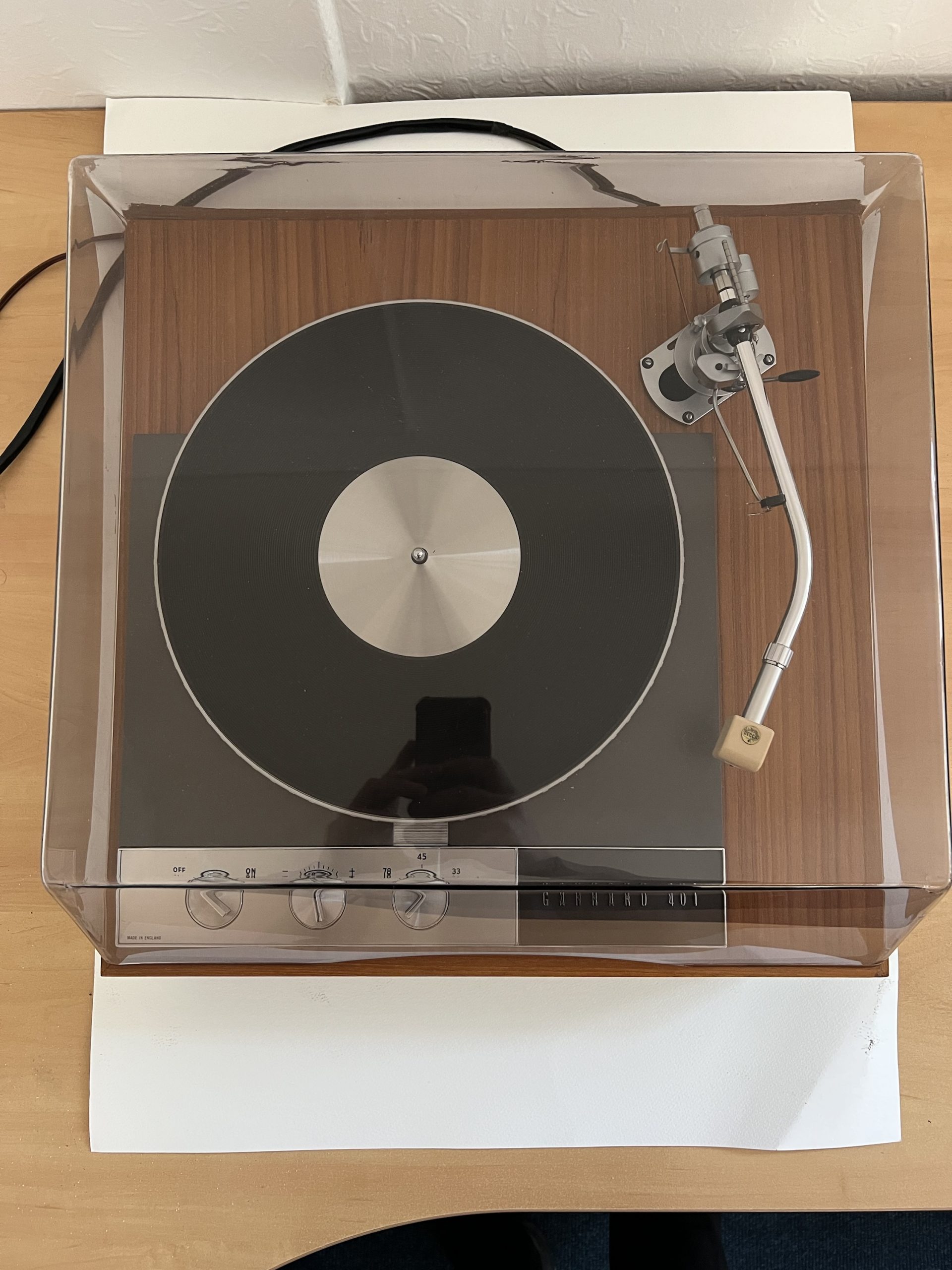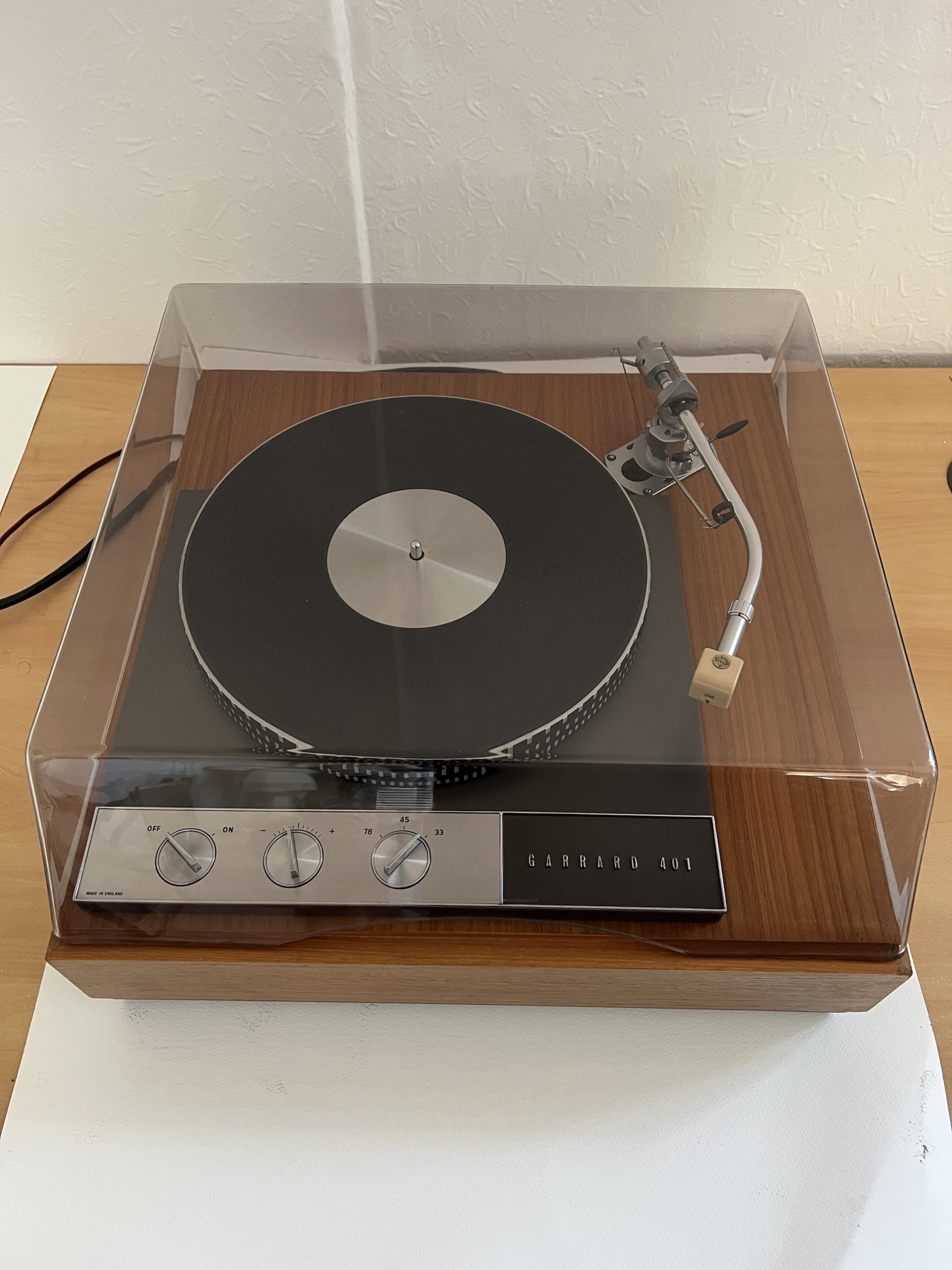 Garrard 401 transcription turntable (1960s–70s, Made in England) in later custom plinth with acrylic dust cover. Fitted with SME 3009 tonearm (desirable) and Decca H4E cartridge. Idler-drive deck (highly regarded audiophile model).