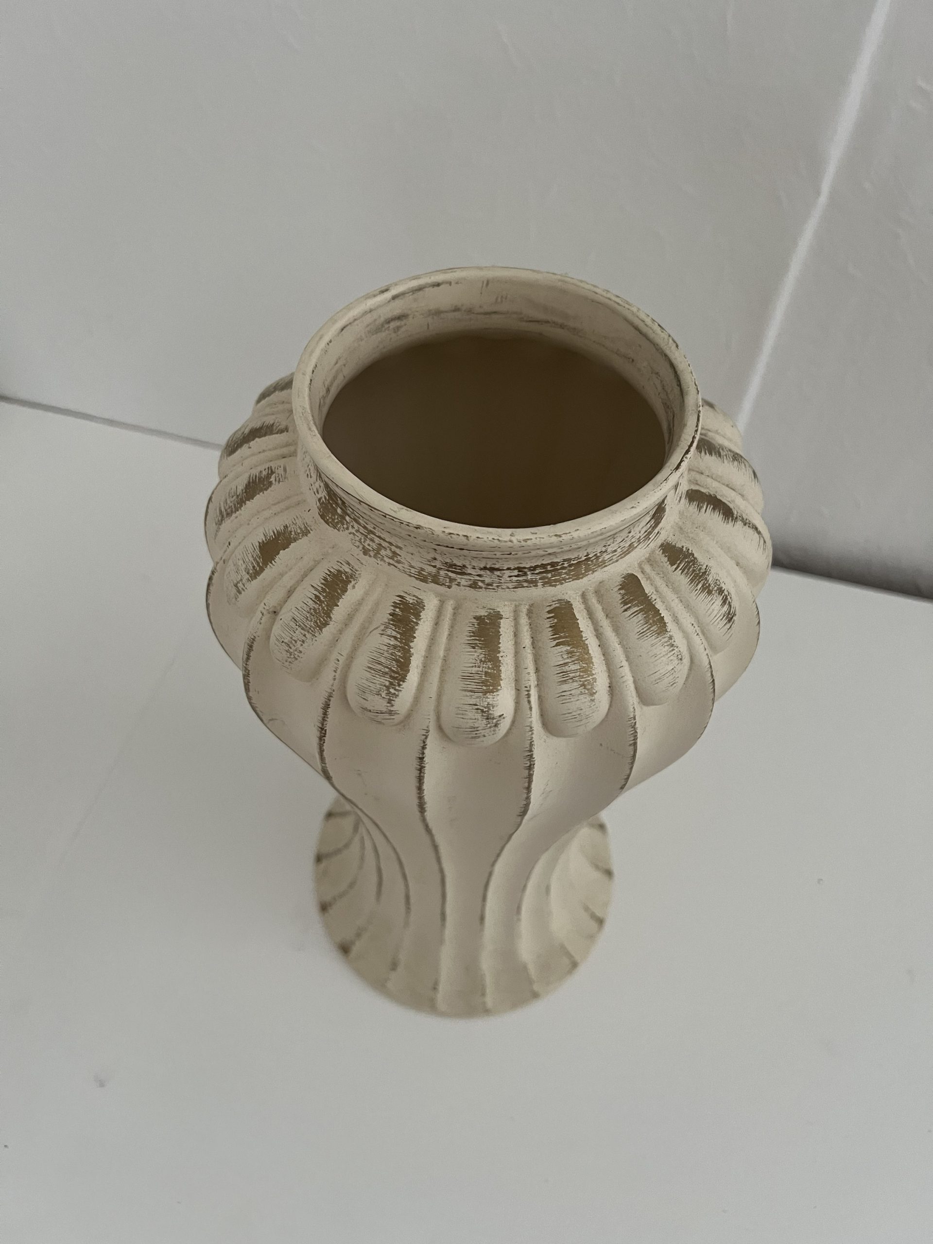 Decorative ceramic floor vase / large mantel vase. Cream base with distressed antique-style finish (brown rubbed edges). Moulded vertical fluted design with scalloped shoulder. Modern decorative piece (likely 2000s–present, mass-produced home décor). Weight ~1.45kg suggests ceramic/stoneware, not antique. No visible maker’s mark.