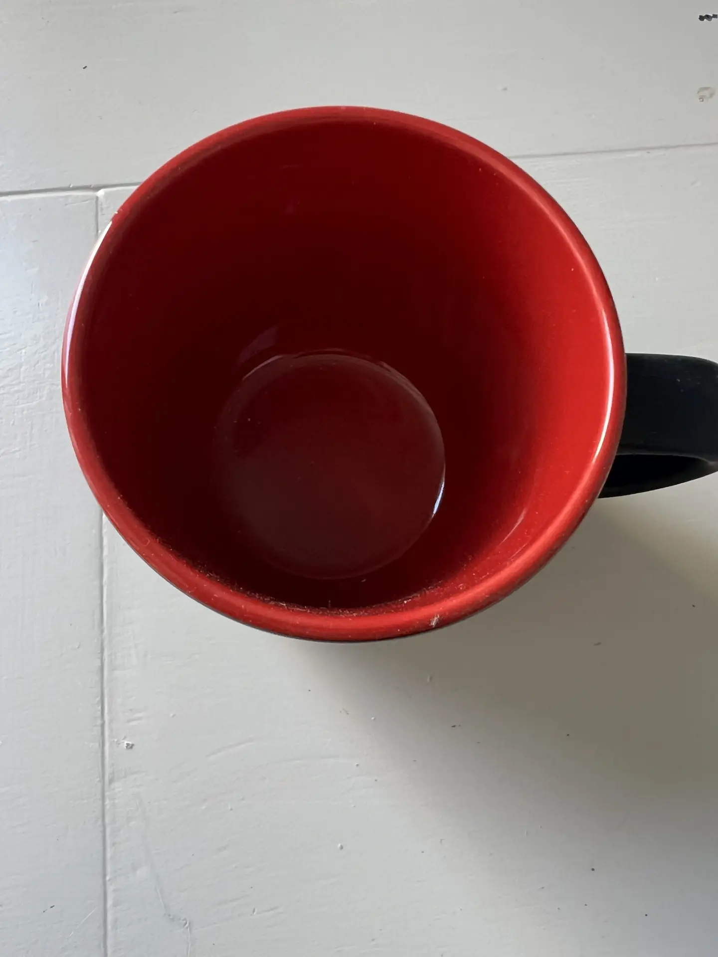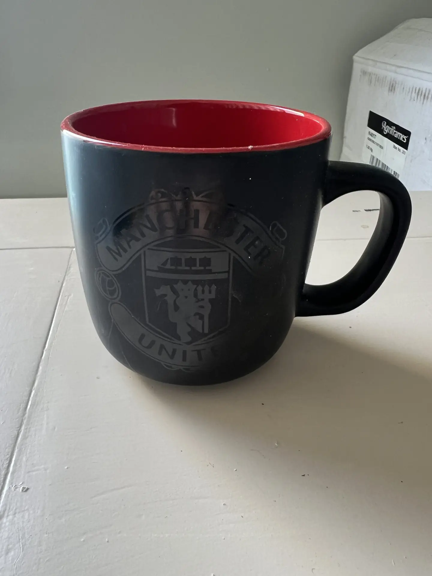 novelty ceramic mug, Manchester United branding (official-style crest, matte black exterior with red interior). Likely modern mass-produced fan merchandise (last 10–15 years).