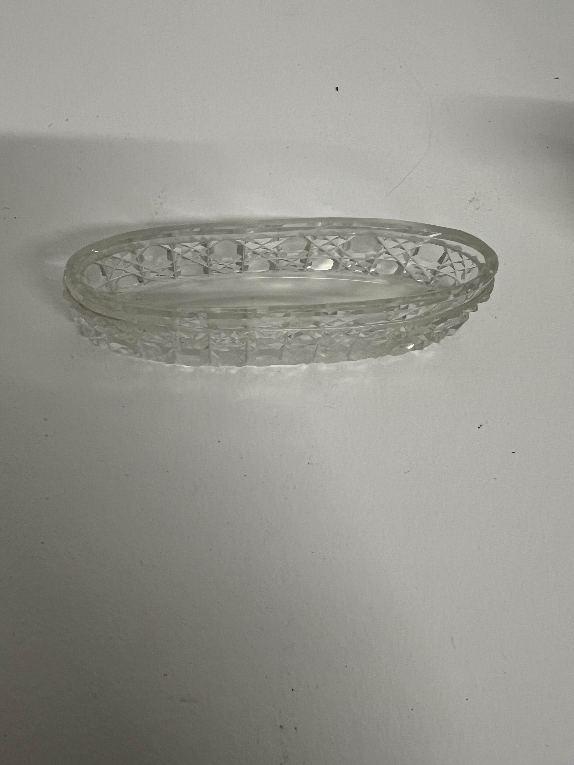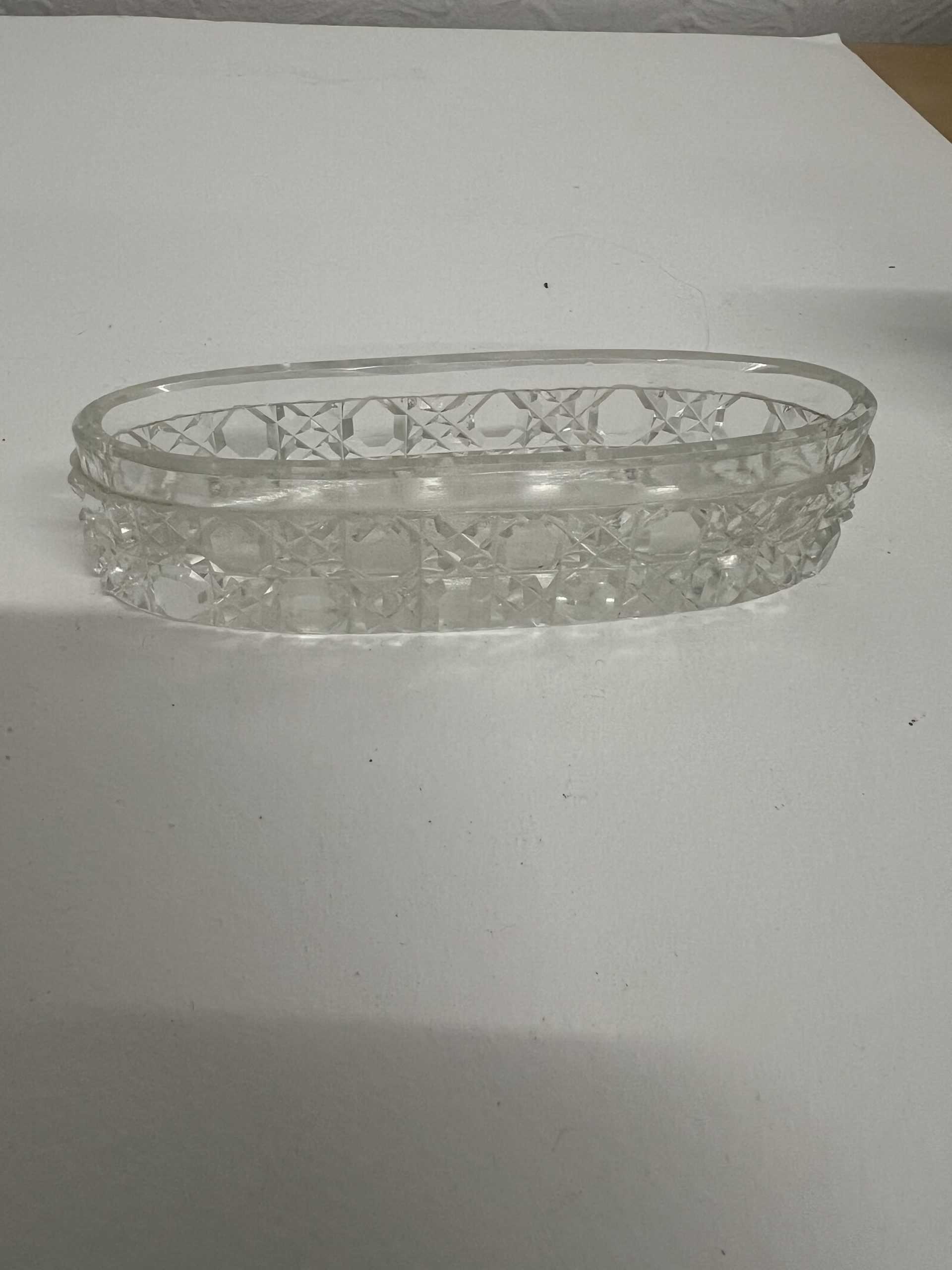 Oval cut glass serving dish / trinket tray. Pressed/cut glass with repeating geometric panel pattern (octagon/diamond band). Likely mid–late 20th century mass-produced decorative glass rather than high-end crystal.