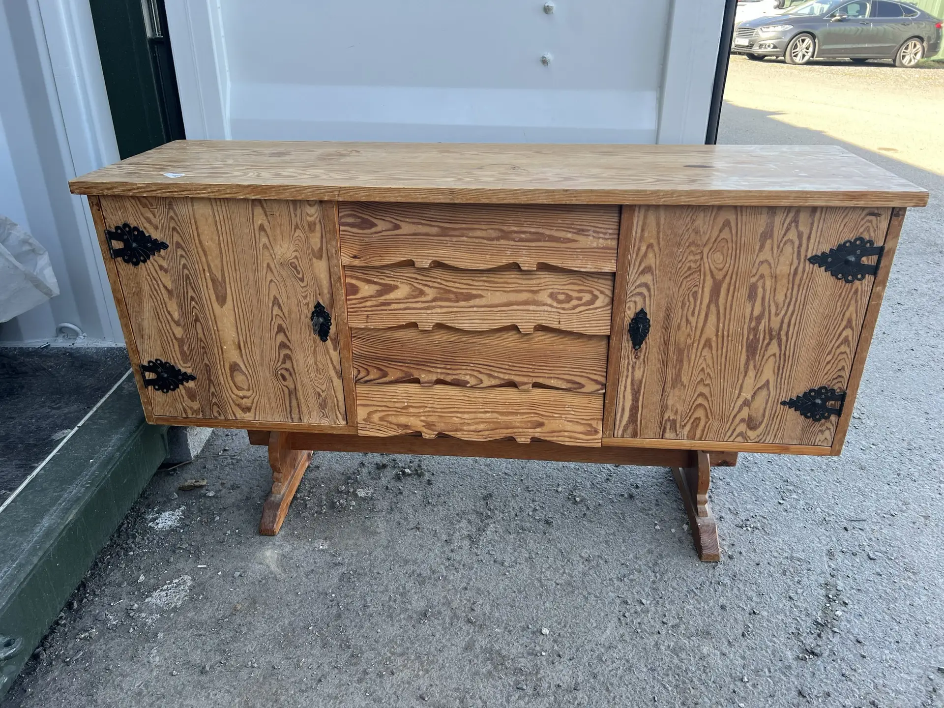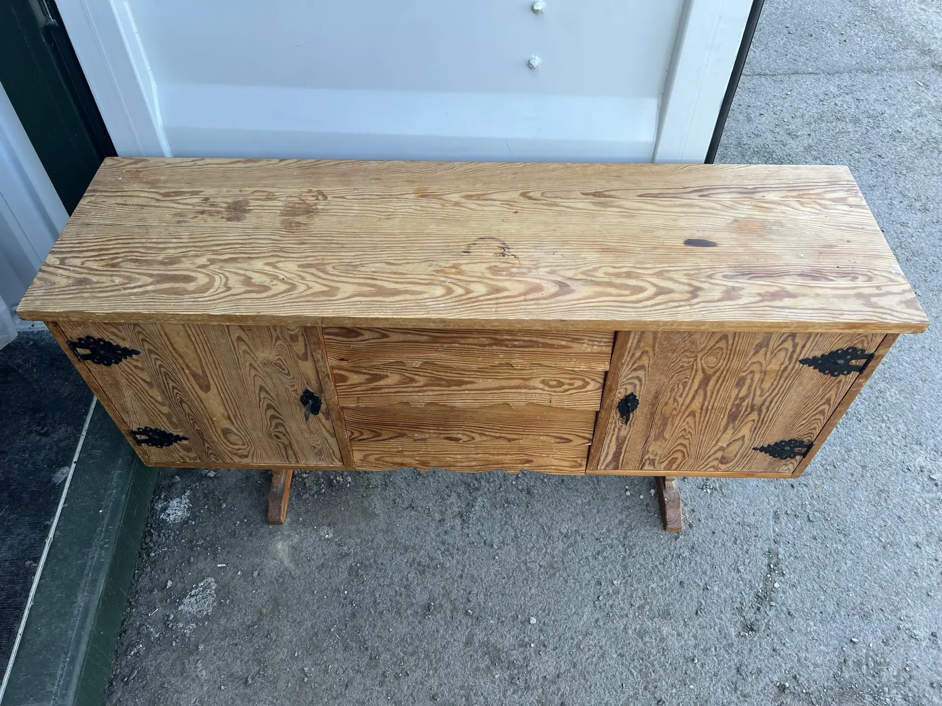 Rustic pine sideboard / dresser base, likely 1970s–90s reproduction in “old farmhouse / Spanish revival” style. Solid pine with heavy grain, decorative black iron strap hinges and handles. Layout: 2 cupboards (left/right) + 3 central drawers. Raised on trestle-style legs.