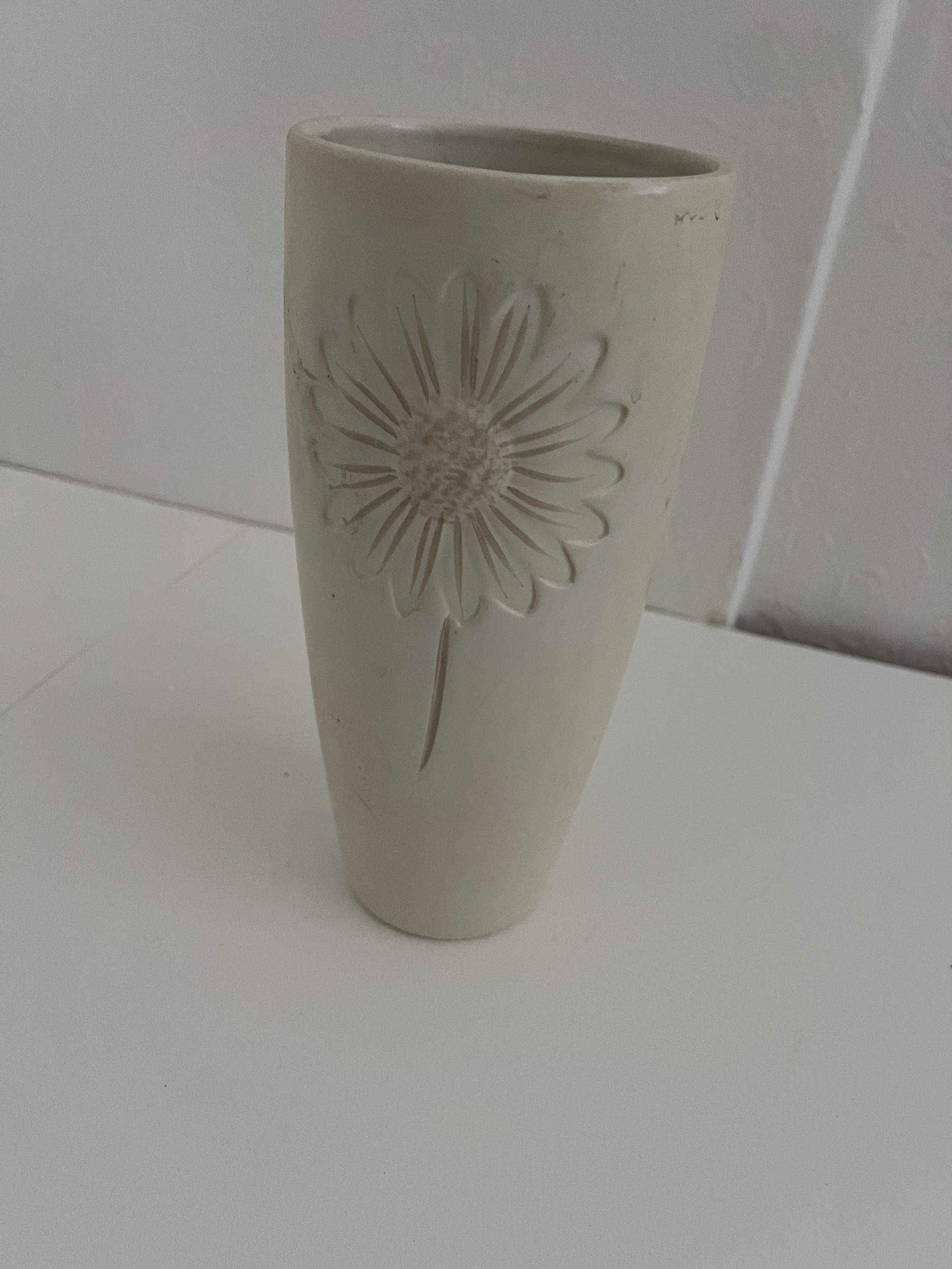 Modern decorative ceramic vase, tall tapered form with embossed daisy/flower motif. Matte off-white/cream finish. Likely mass-produced home décor (IKEA/Next/Homebase type), late 2000s–present. No visible maker’s mark shown.