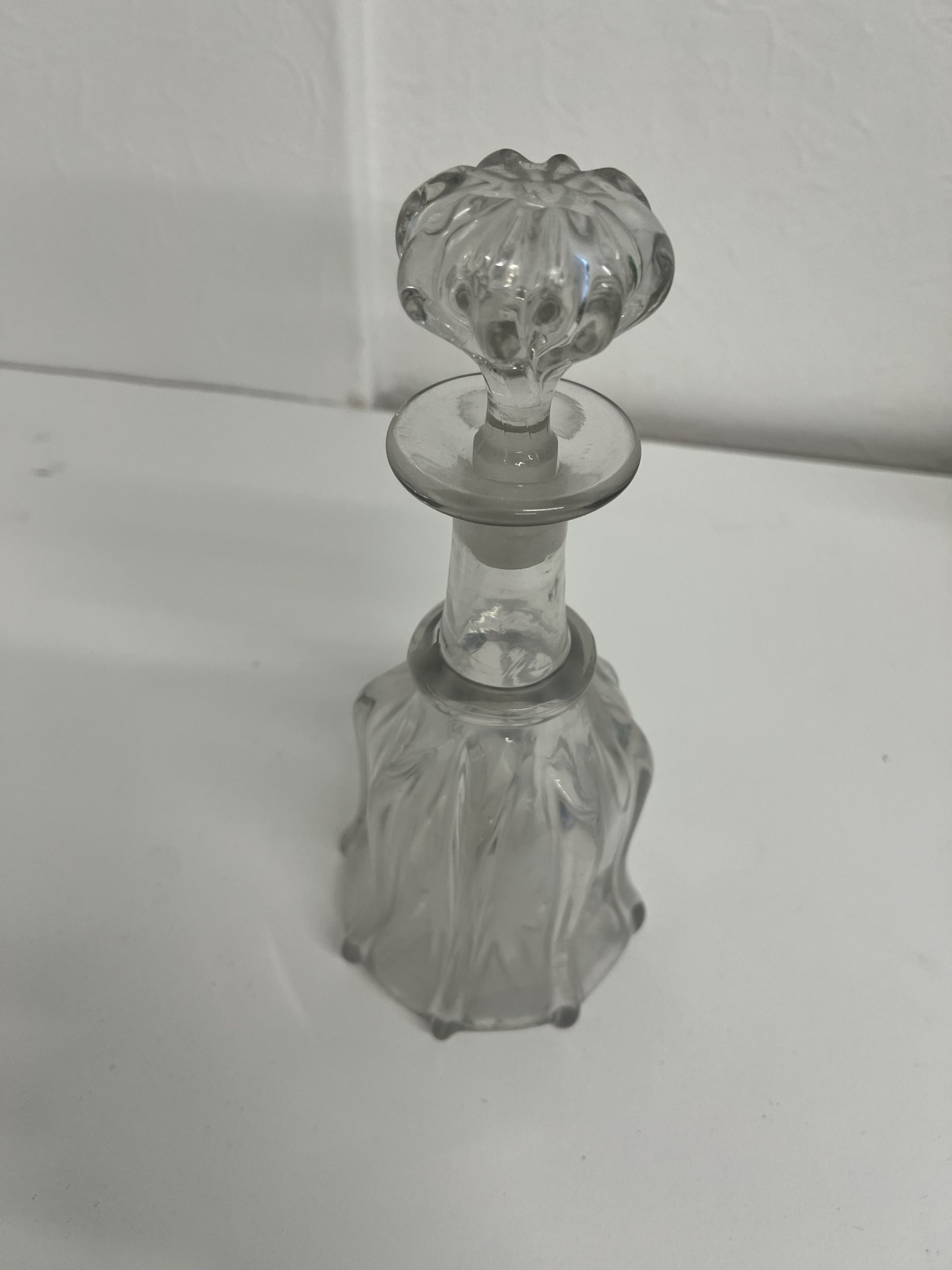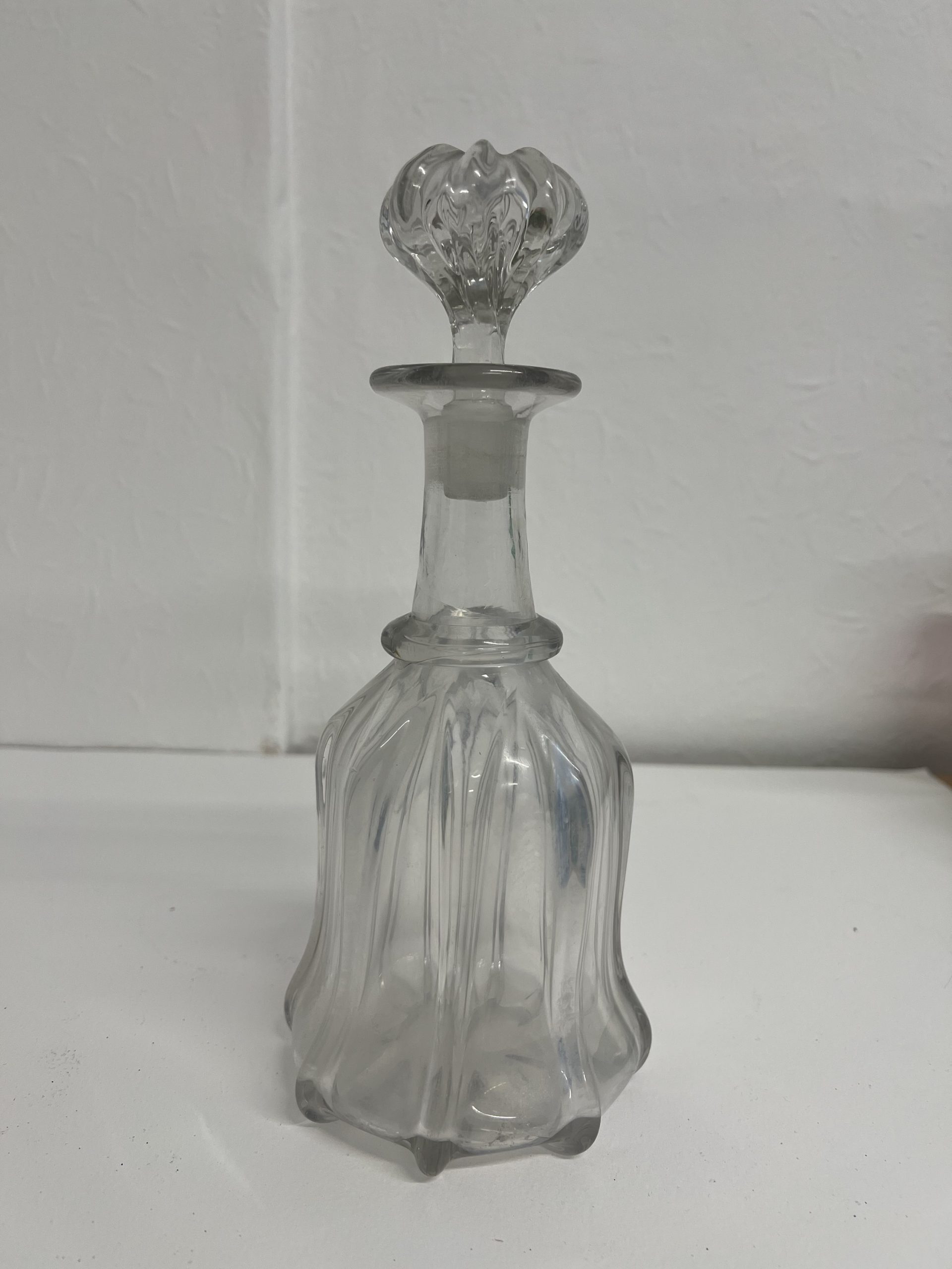 Clear pressed glass decanter / stopper bottle, mid-century (likely 1950s–70s). Moulded fluted body with matching pressed stopper (not cut crystal). Ground neck and stopper indicate it was intended for spirits or display. No visible maker’s mark.