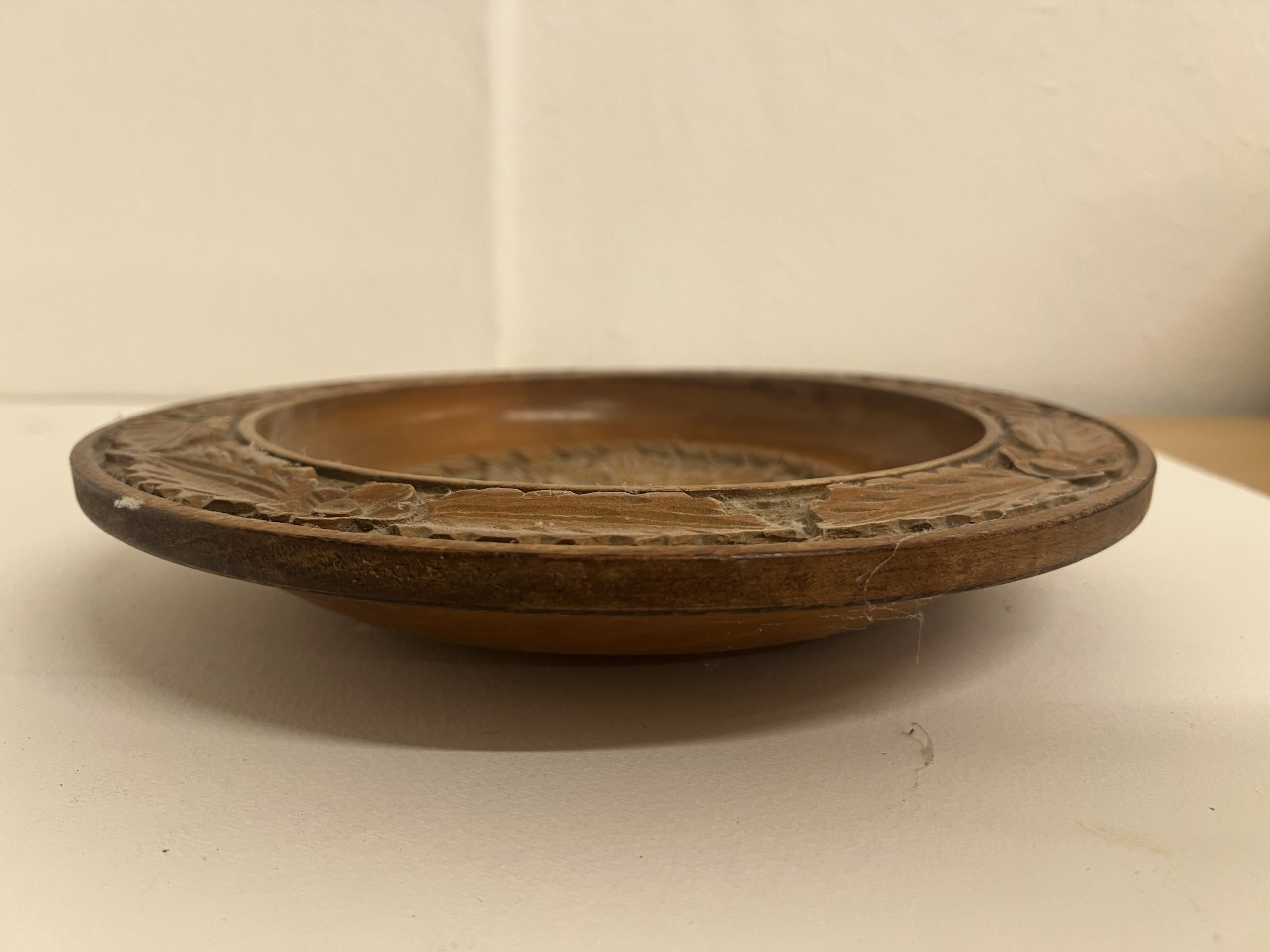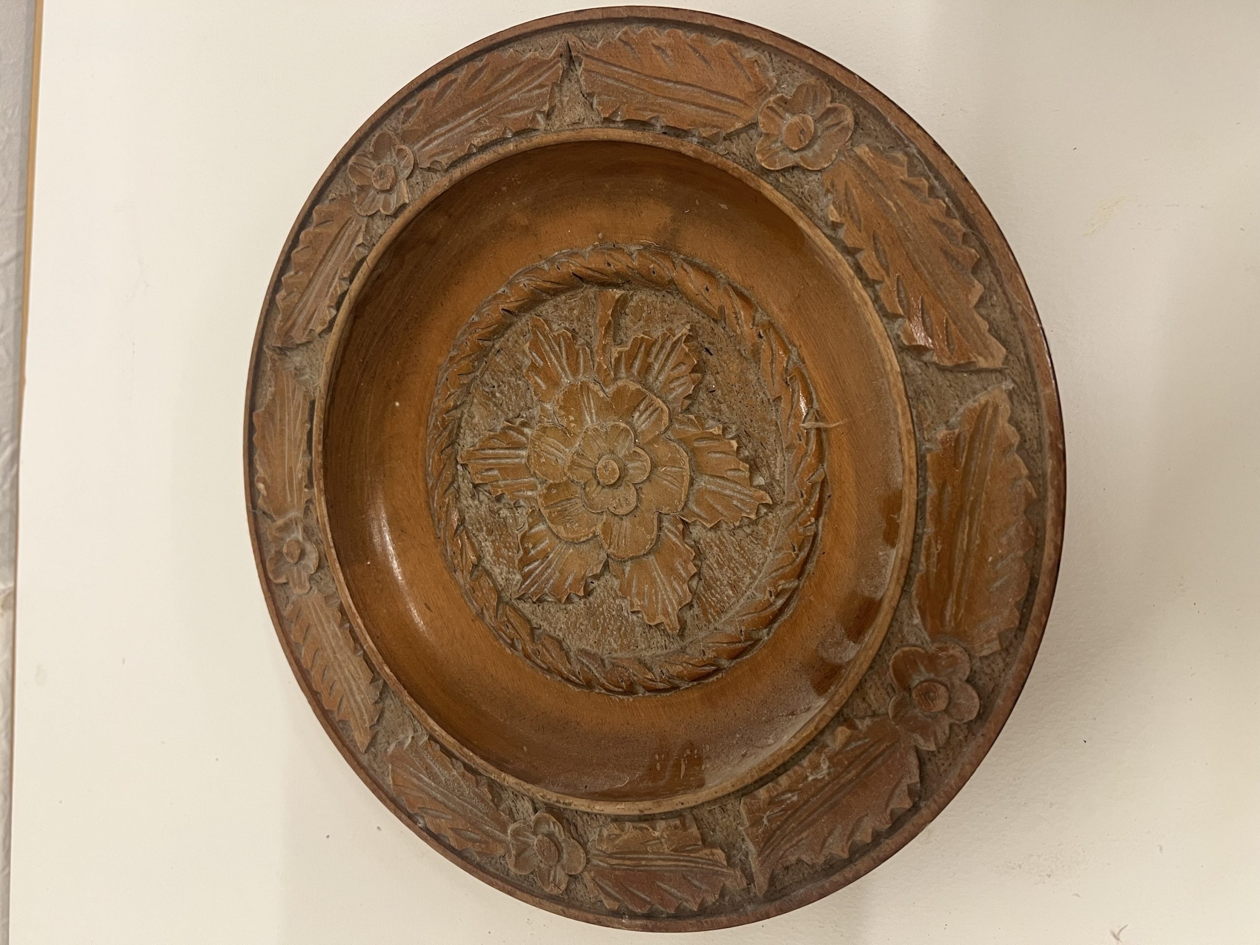 Hand-carved wooden decorative bowl / plate, likely folk/tramp art style with floral and leaf carving. Probably mid-20th century tourist or decorative piece rather than fine carving. Hardwood with stained finish.
