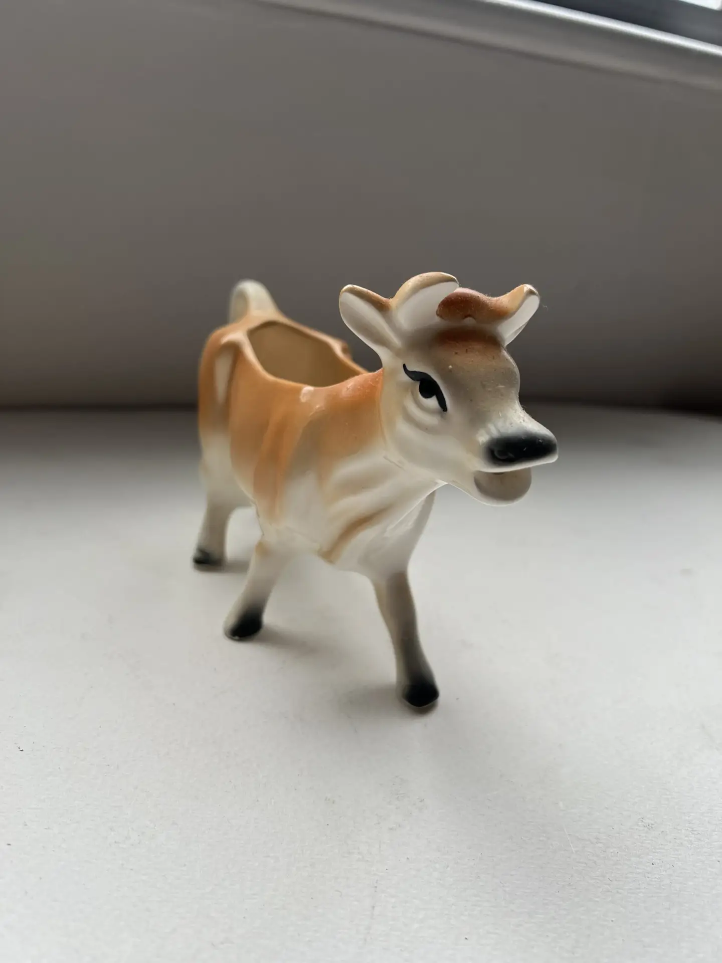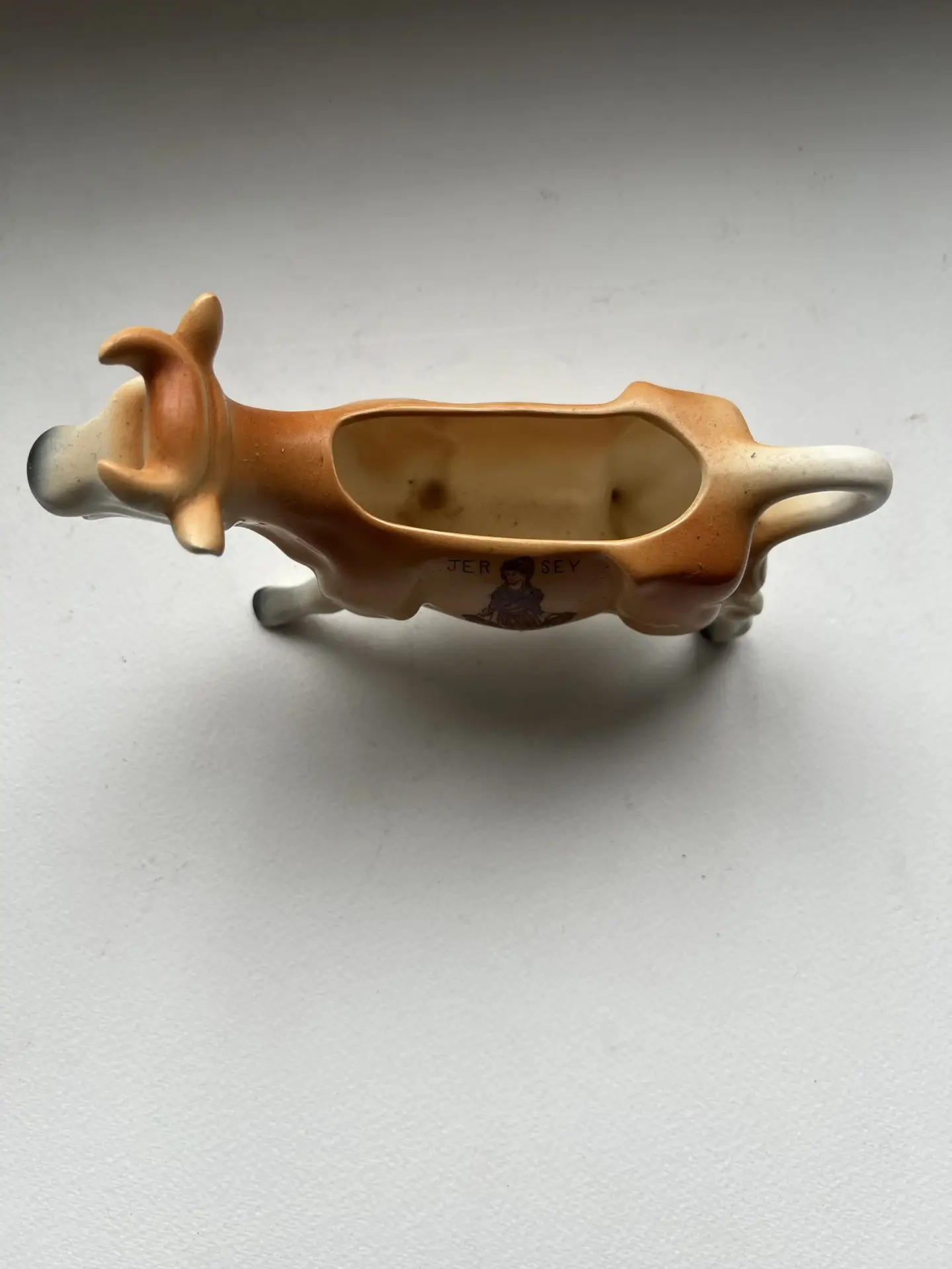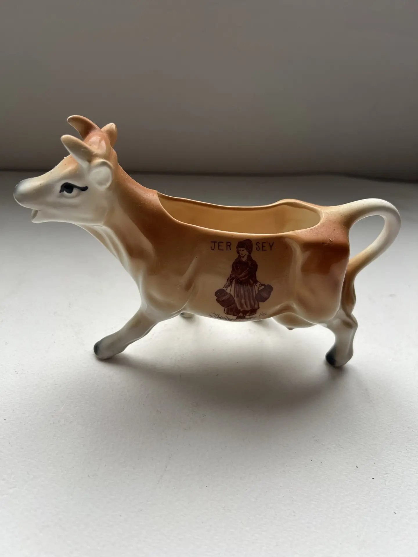Ceramic Jersey cow cream jug / novelty milk jug, mid–late 20th century tourist ware. Marked “JERSEY” with traditional milkmaid transfer. Hand-painted glaze in tan/white. Common Channel Islands souvenir piece.