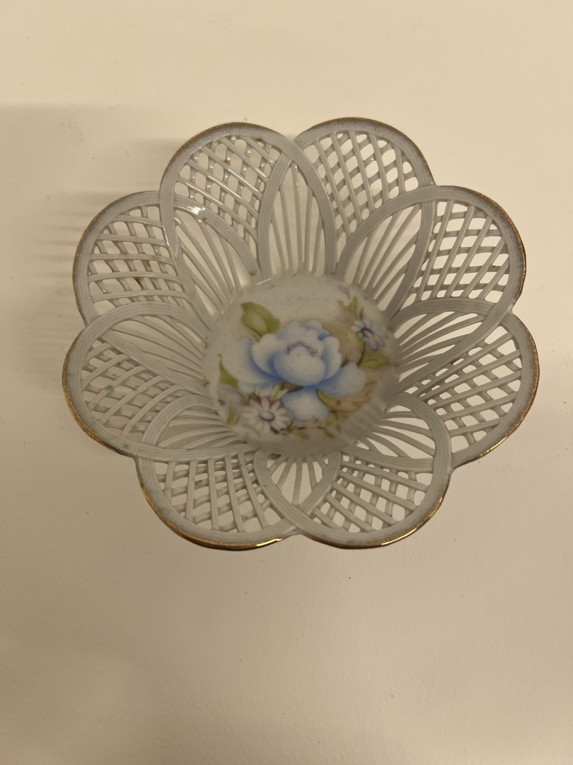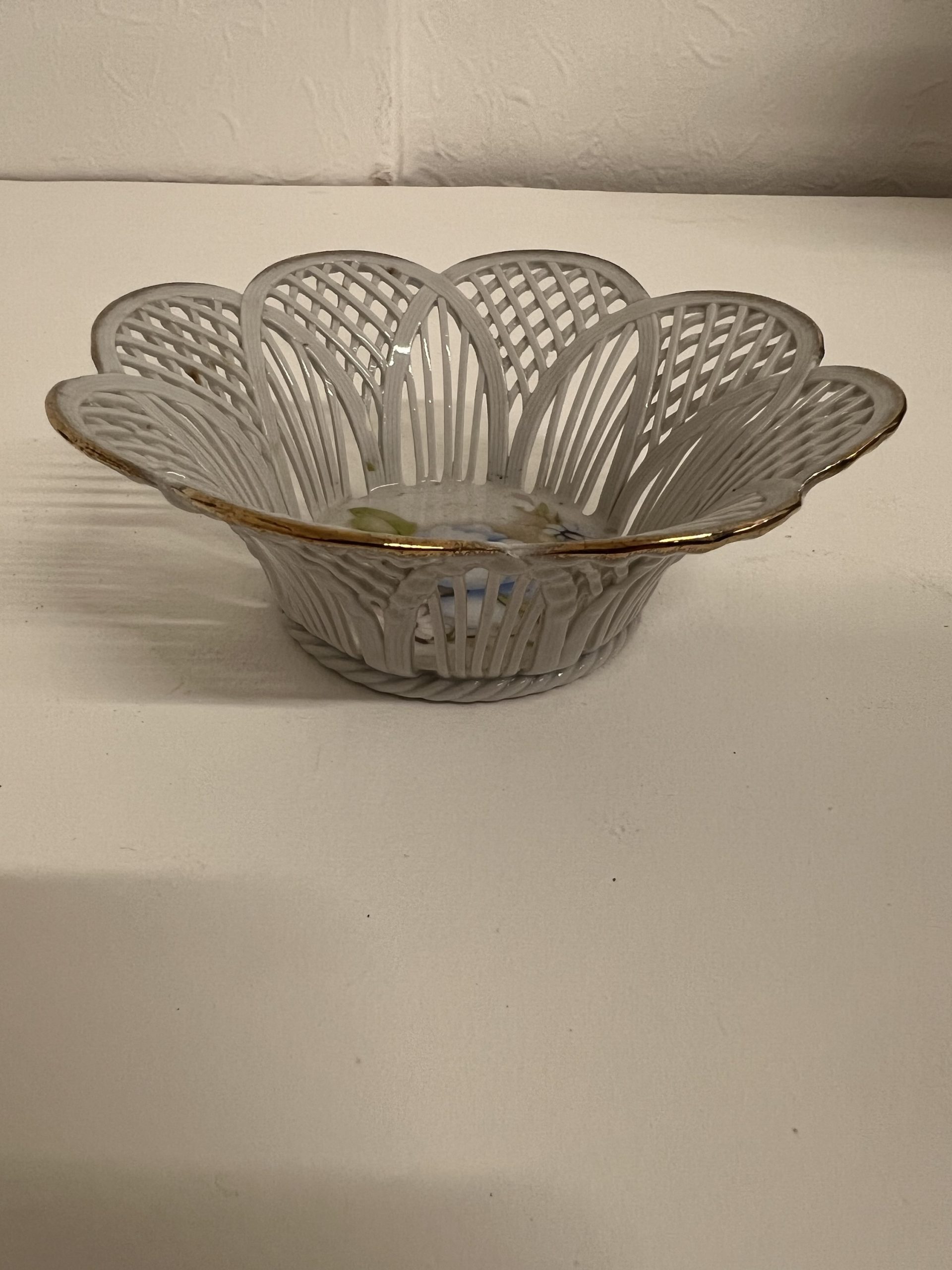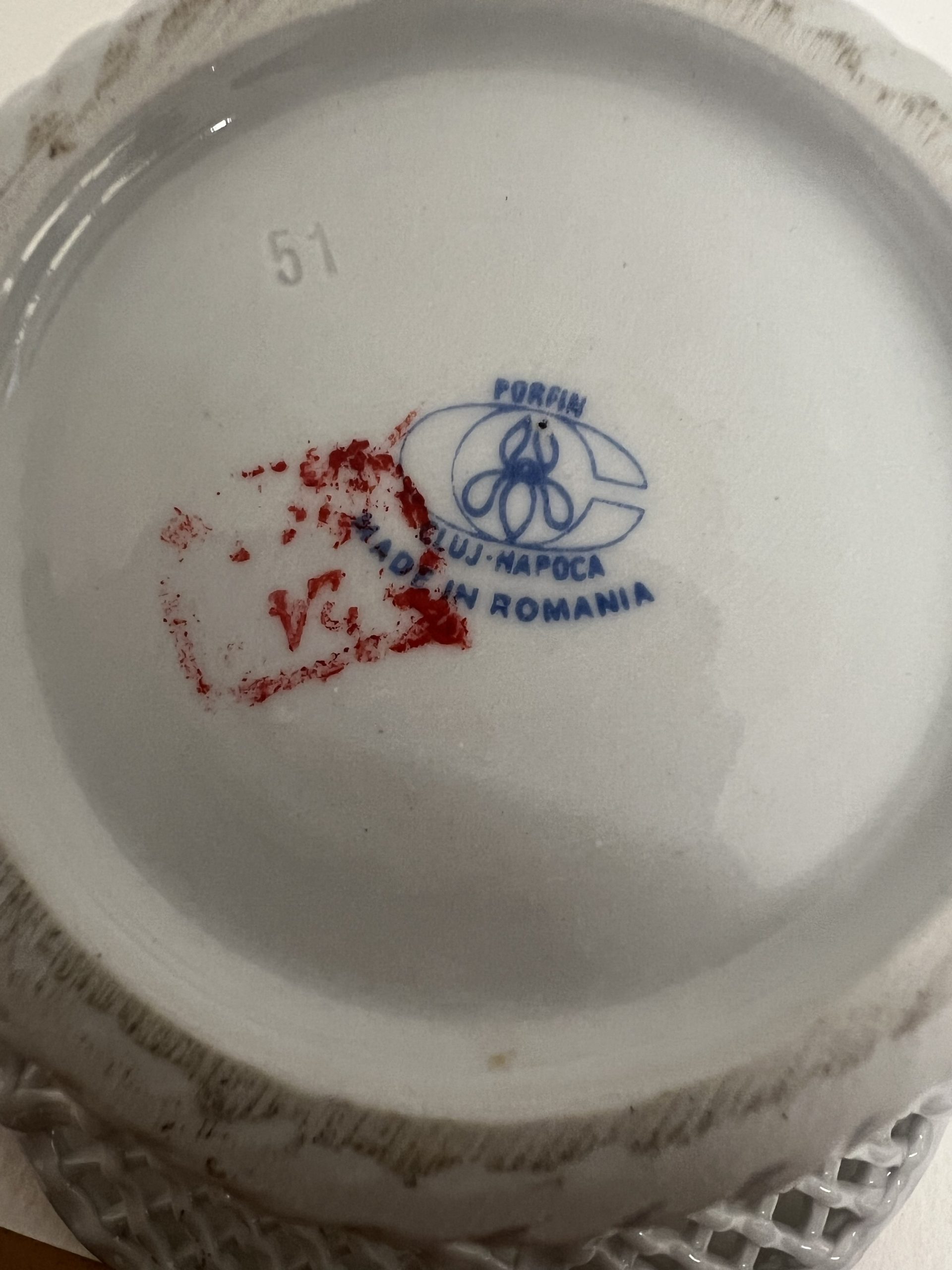 Romanian porcelain lattice bowl / bonbon dish by Porfin, Cluj-Napoca (Made in Romania). Likely mid–late 20th century export piece. Openwork “basket” design with scalloped rim, hand-painted floral centre (blue flower), and gilt edging.