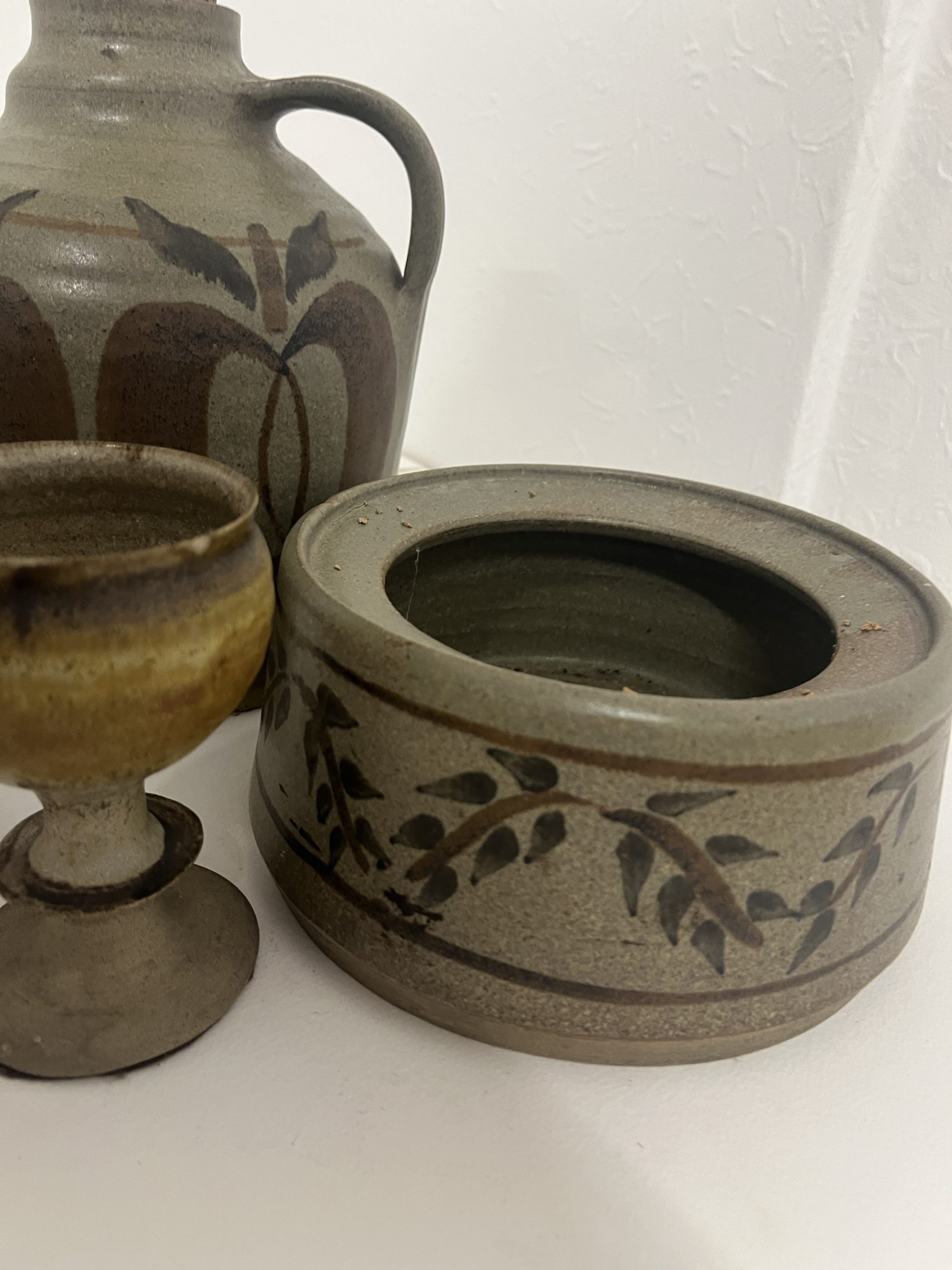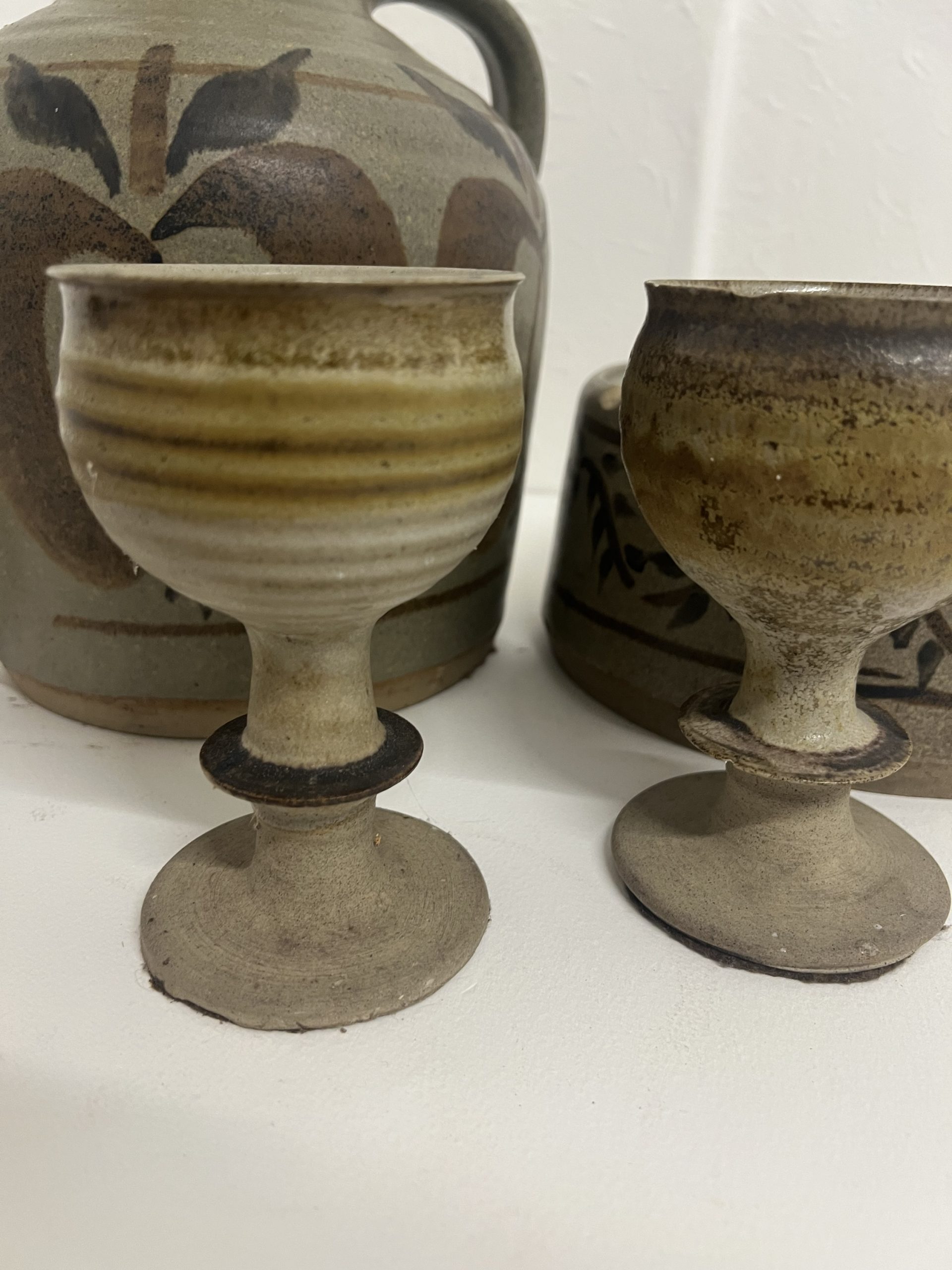 Vintage studio pottery drinks dispenser set (stoneware), likely UK/European, 1970s–80s. Hand-thrown with slip-decorated fruit (apple/pear style) and leafy banding. Includes: main barrel with tap, base stand, and two matching goblets. Earth-tone glaze typical of studio/folk pottery.