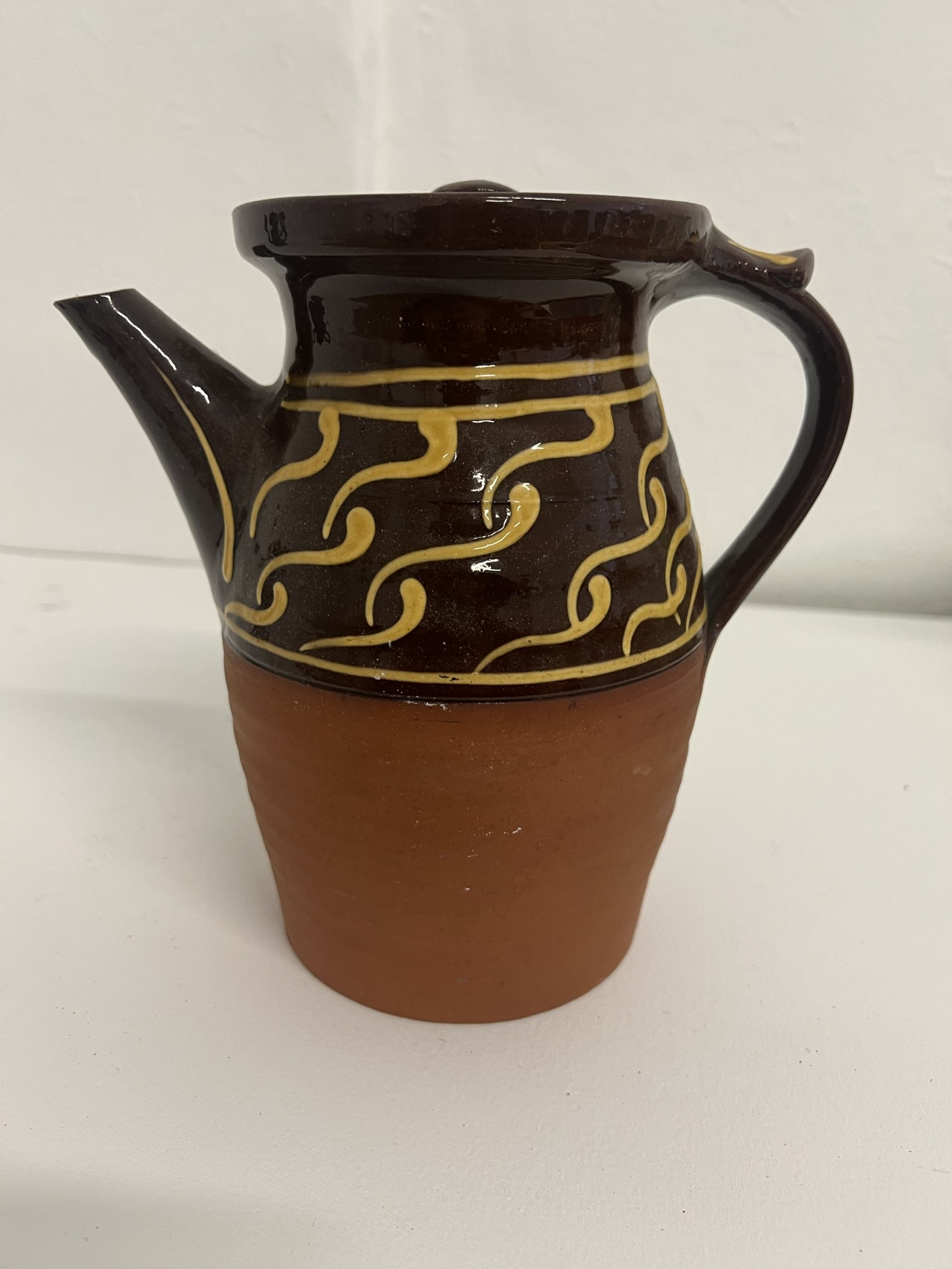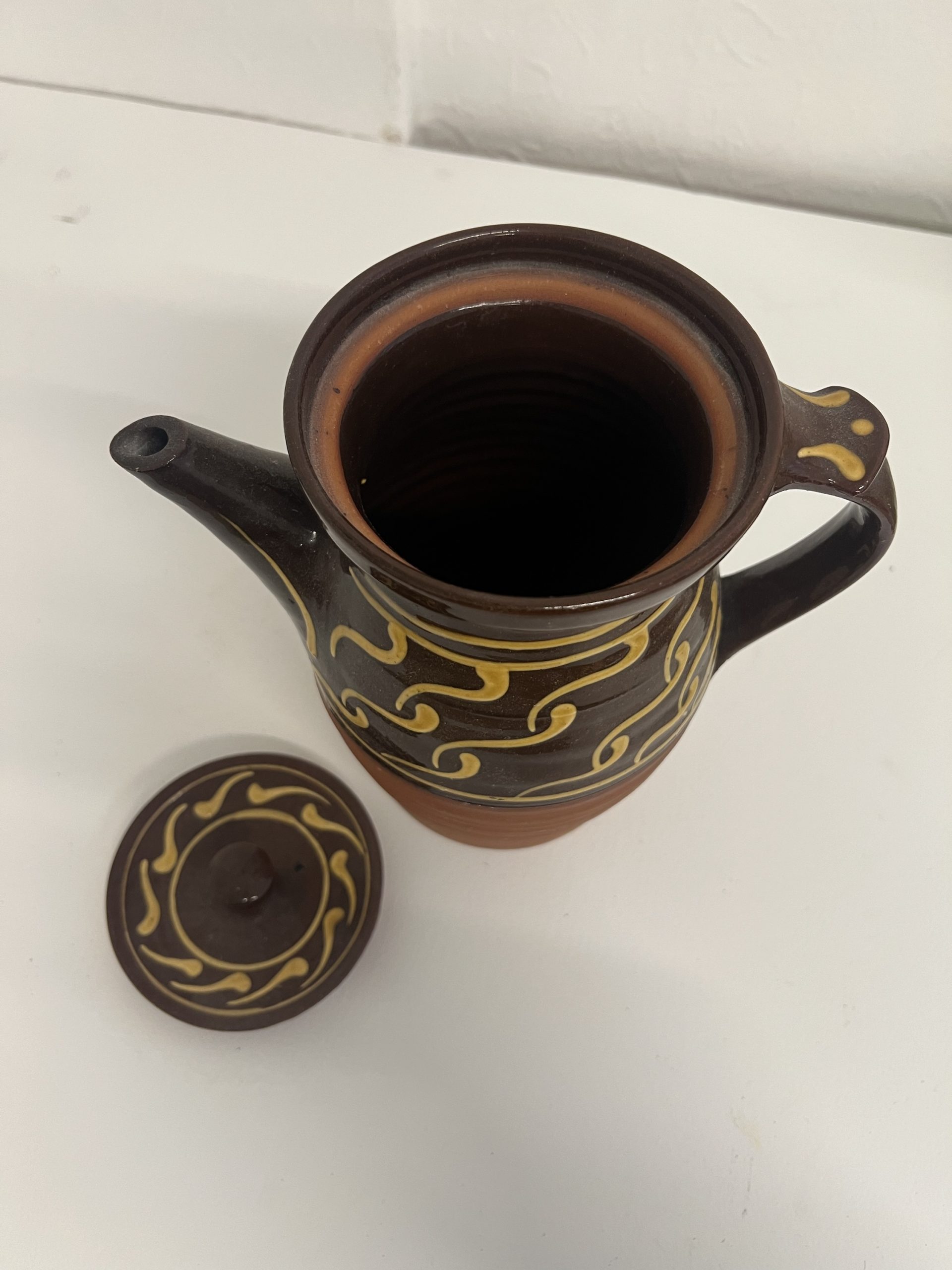 Vintage studio pottery coffee pot / teapot, likely UK or European (1960s–80s). Two-tone glaze: dark brown gloss upper with slip-trailed yellow swirl decoration, terracotta lower body. Hand-thrown with applied handle and spout. Lid present. No visible maker’s mark