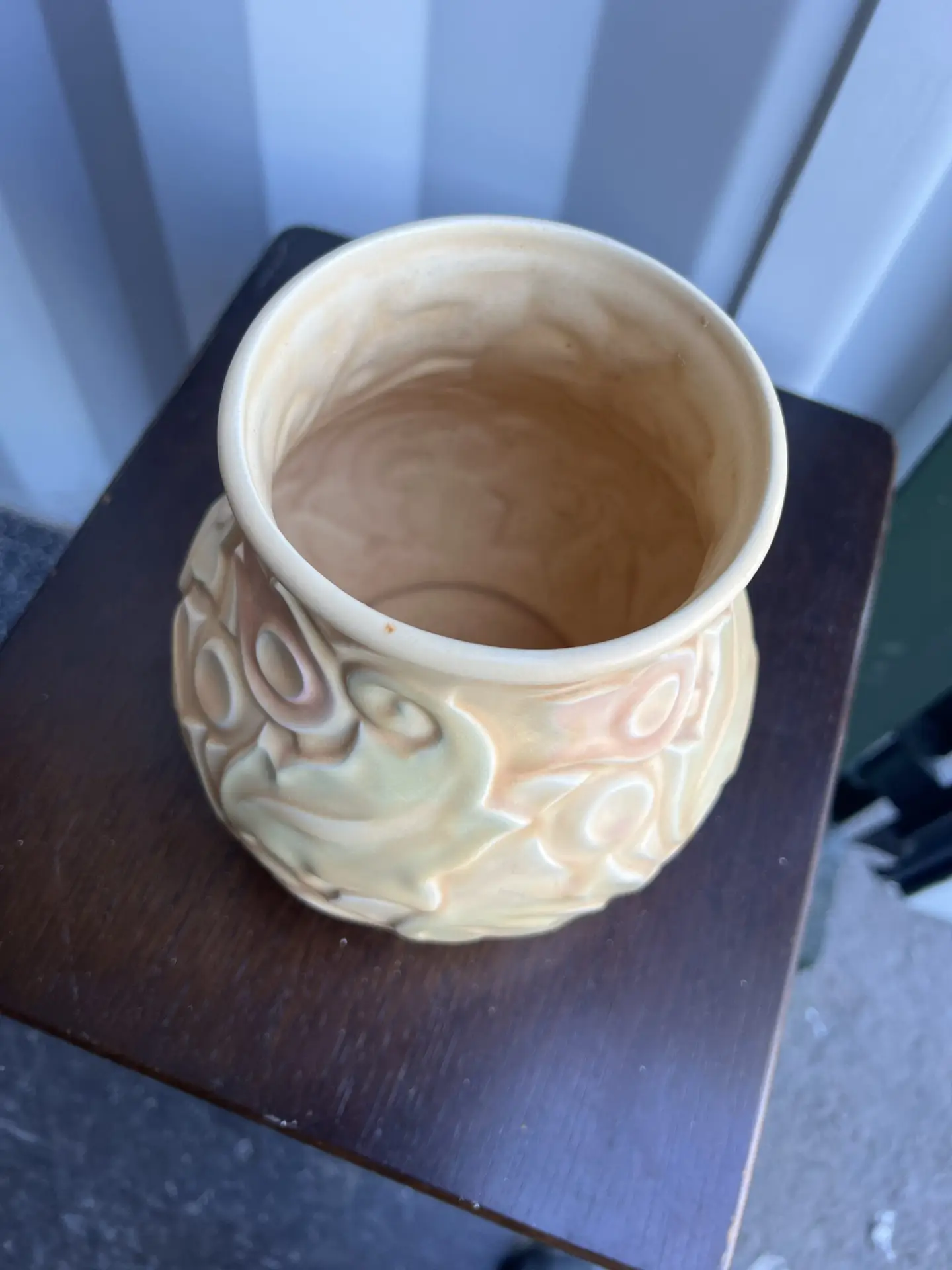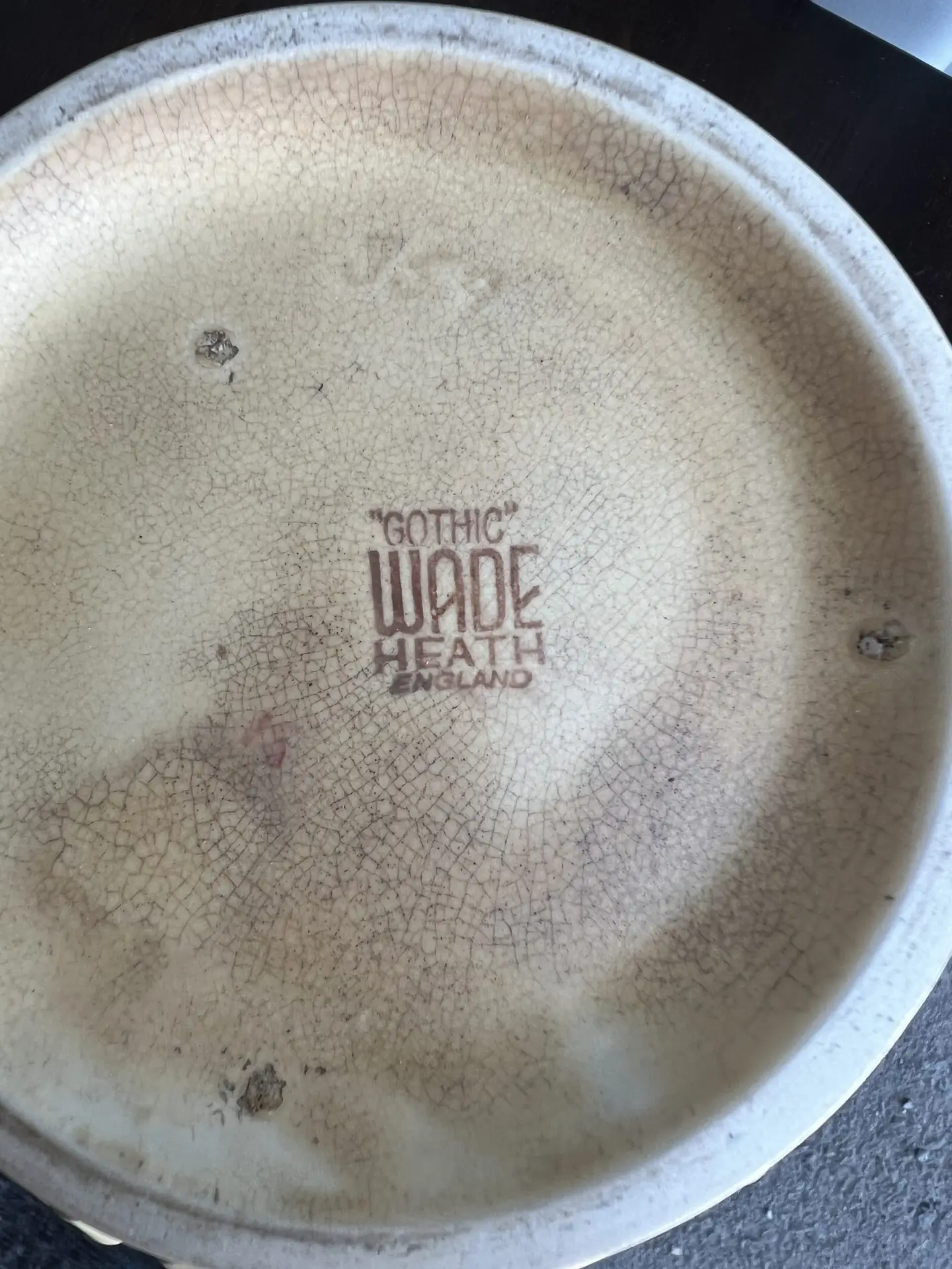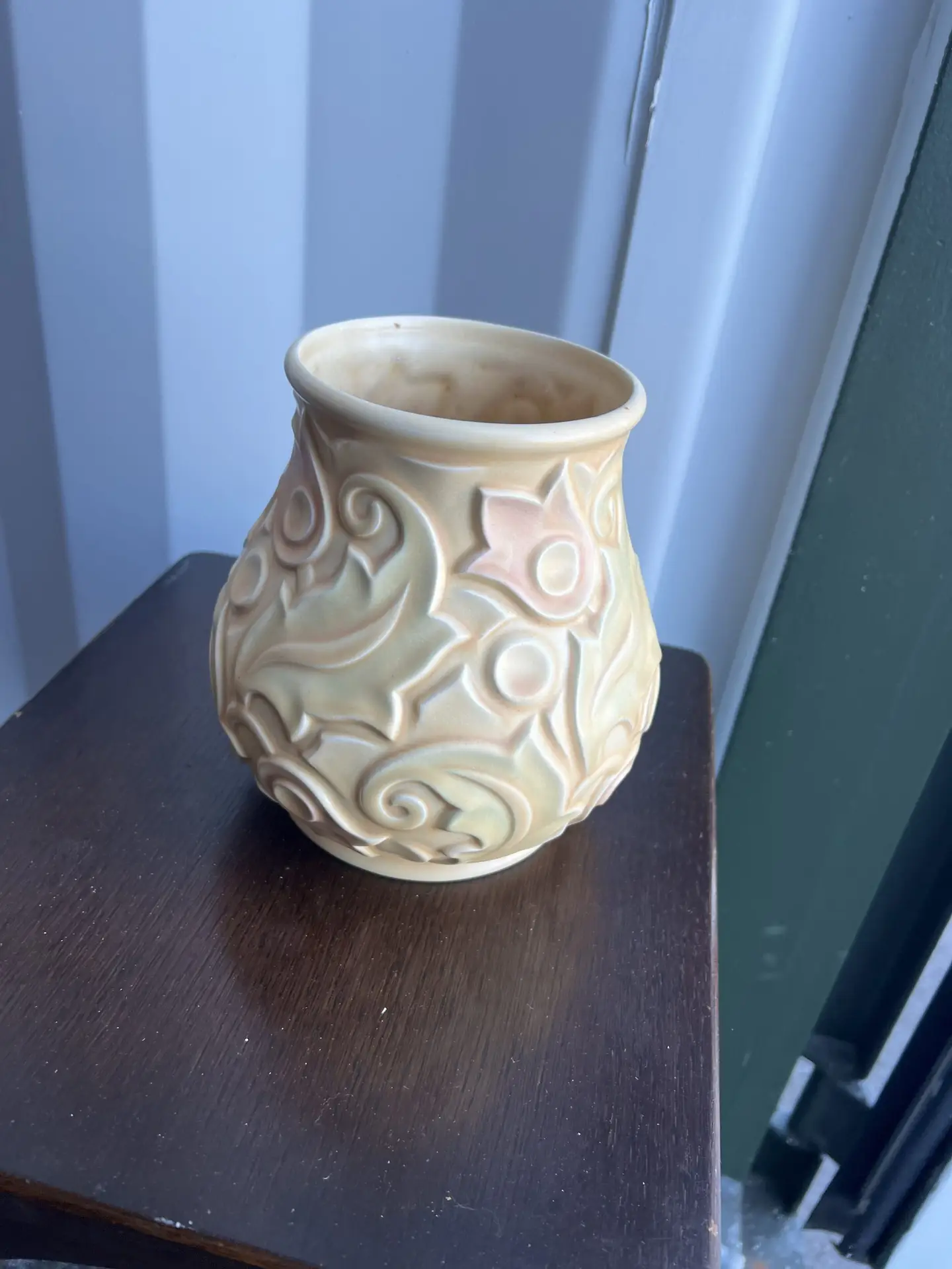 Wade Heath England ceramic vase/planter, “Gothic” pattern (marked to base). Likely mid-late 20th century. Matte glazed earthenware with raised floral/scroll relief.